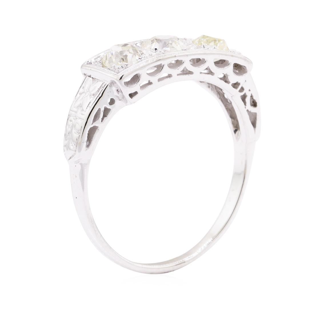 One electronically tested 14KT white gold lady's cast three stone straight line ring with a tapered shank with a bright polish with milgrain detailing finish. The featured lady's ring has a vintage motif and a shank measuring 1.65 millimeters wide. Identified with markings of '14K'. Condition is new, good workmanship. Containing: Three prong set old mine cut diamonds, measuring 4.45 - 4.04 x 2.64mm (depth est.) , 10.00.%. GTCF approximate total weight of 3 Stones = 1.00ct. Graded in the setting. Color J - L Clarity VS-1 to VS-2 Cut Good. Total Weight of Diamonds 1.00ct.. Total Weight of Ring 3.10gm GAS Appraised at $3145.00. GAS Appraised at $3,145.00.