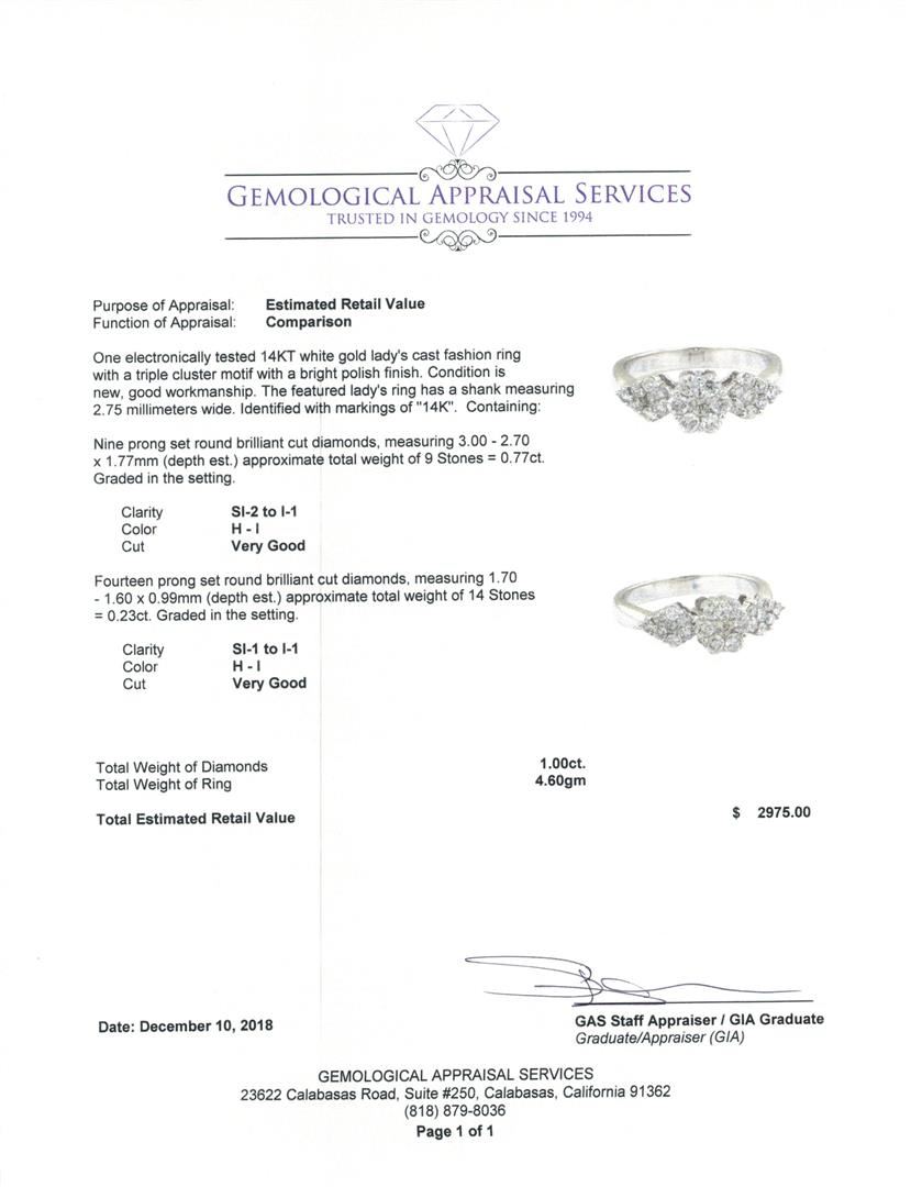 One electronically tested 14KT white gold lady's cast fashion ring with a triple cluster motif with a bright polish finish. The featured lady's ring has a shank measuring 2.75 millimeters wide. Identified with markings of '14K'. Condition is new, good workmanship. Containing: Nine prong set round brilliant cut diamonds, measuring 3.00 - 2.70 x 1.77mm (depth est.) approximate total weight of 9 Stones = 0.77ct. Graded in the setting. Color H - I Clarity SI-2 to I-1 Cut Very Good Fourteen prong set round brilliant cut diamonds, measuring 1.70 - 1.60 x 0.99mm (depth est.) approximate total weight of 14 Stones = 0.23ct. Graded in the setting. Color H - I Clarity SI-1 to I-1 Cut Very Good. Total Weight of Diamonds 1.00ct.. Total Weight of Ring 4.60gm GAS Appraised at $2975.00. GAS Appraised at $2,975.00.
