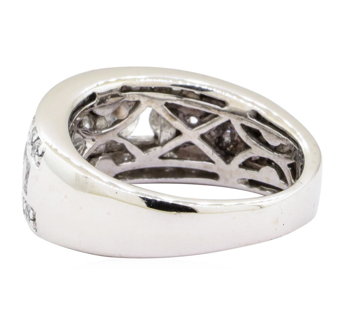 One electronically tested 14KT white gold lady's cast fashion ring with a three row tapered shank with a bright polish finish. The featured lady's ring has a shank measuring 3.20 millimeters wide. Condition is Good. Containing: One channel set round brilliant cut diamond, measuring 3.40 - 3.35 x 2.10mm (depth est.) approximate weight of 0.15ct. Graded in the setting. Color H Clarity I-1 Cut Good Six channel set round brilliant cut diamonds, measuring 3.00 - 2.90 x 1.83mm (depth est.) approximate total weight of 6 Stones = 0.60ct. Graded in the setting. Color H - I Clarity SI-1 to SI-2 Cut Very Good Thirty-Two prong set round brilliant cut diamonds, measuring 1.30 - 1.25 x 0.79mm (depth est.) approximate total weight of 32 Stones = 0.25ct. Graded in the setting. Color H - I Clarity SI-1 to I-1 Cut Good. Total Weight of Diamonds 1.00ct.. Total Weight of Ring 4.70gm GAS Appraised at $3425.00. GAS Appraised at $3,425.00.