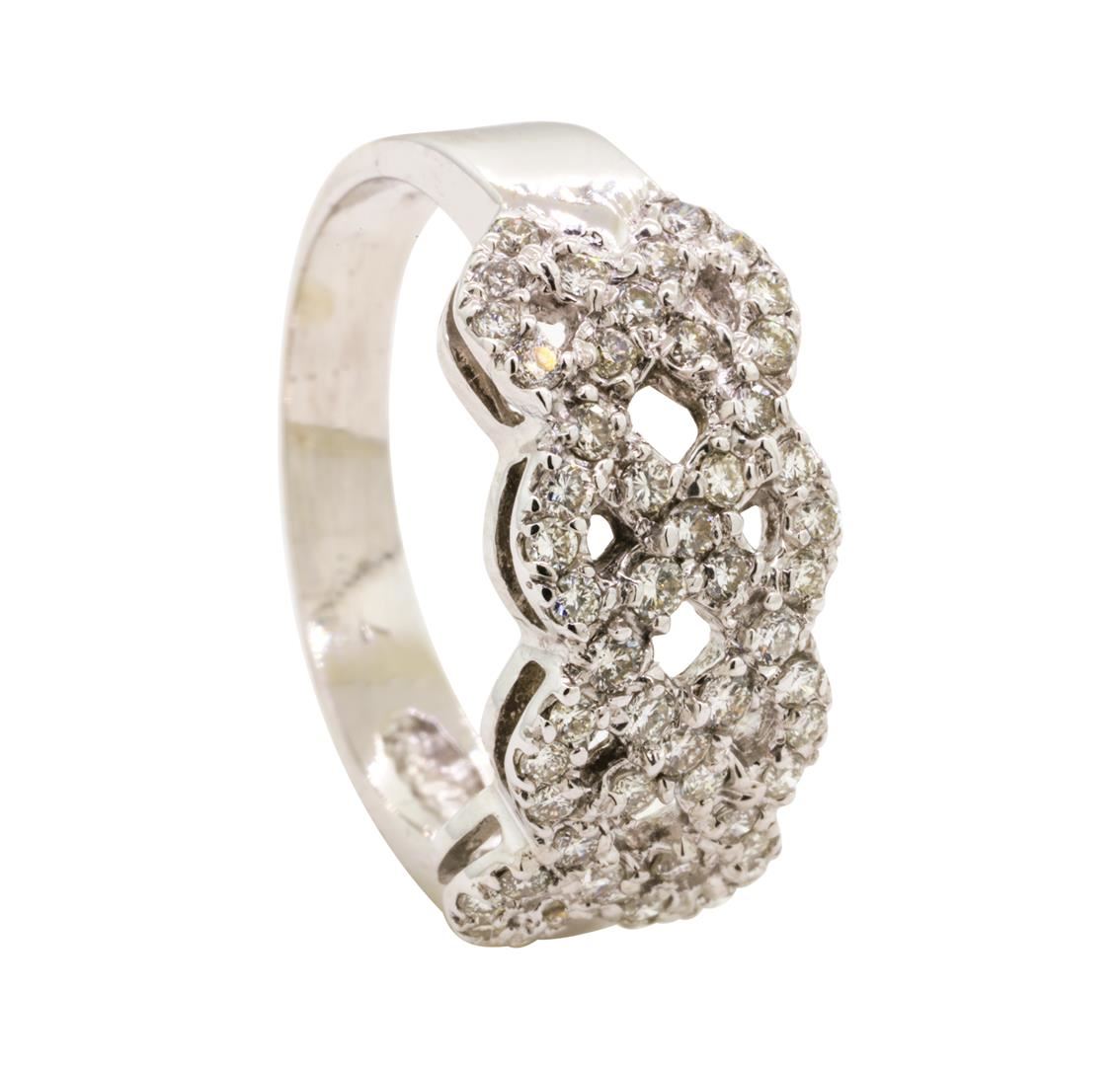 One electronically tested 14KT white gold lady's cast fashion ring with a four row braided motif with a bright polish finish. The featured lady's ring has a shank measuring 3.20 millimeters wide. Identified with markings of '14K'. Condition is like new, good workmanship. Containing: Fifty-Four prong set round brilliant cut diamonds, measuring 1.70 - 1.65 x 1.08mm (depth est.) approximate total weight of 54 Stones = 1.00ct. Graded in the setting. Color I - J Clarity VS-2 to SI-1 Cut Good. Total Weight of Diamonds 1.00ct.. Total Weight of Ring 5.30gm GAS Appraised at $3125.00. GAS Appraised at $3,125.00.