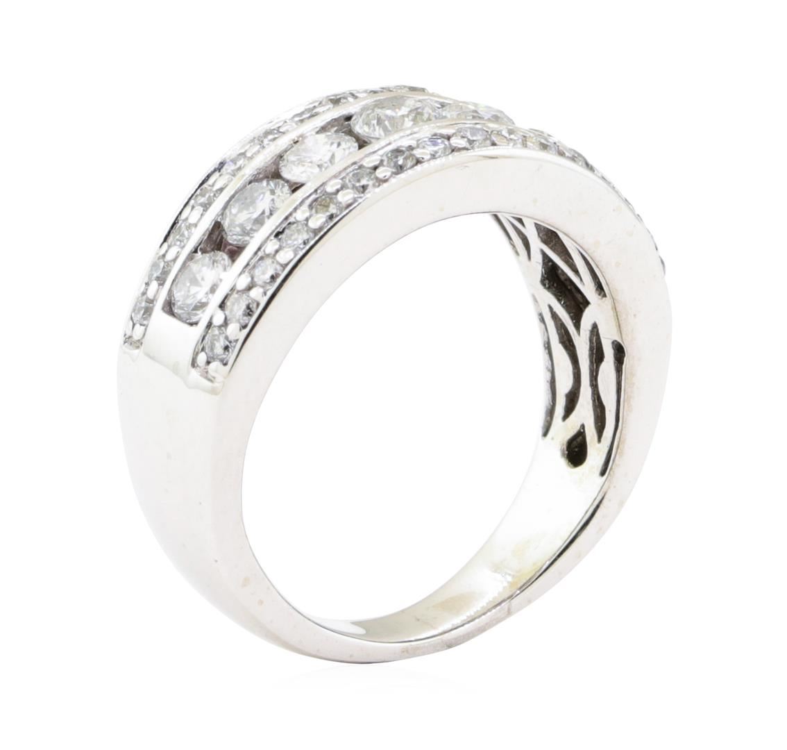 One electronically tested 14KT white gold lady's cast fashion ring with a three row tapered shank with a bright polish finish. The featured lady's ring has a shank measuring 3.20 millimeters wide. Condition is Good. Containing: One channel set round brilliant cut diamond, measuring 3.40 - 3.35 x 2.10mm (depth est.) approximate weight of 0.15ct. Graded in the setting. Color H Clarity I-1 Cut Good Six channel set round brilliant cut diamonds, measuring 3.00 - 2.90 x 1.83mm (depth est.) approximate total weight of 6 Stones = 0.60ct. Graded in the setting. Color H - I Clarity SI-1 to SI-2 Cut Very Good Thirty-Two prong set round brilliant cut diamonds, measuring 1.30 - 1.25 x 0.79mm (depth est.) approximate total weight of 32 Stones = 0.25ct. Graded in the setting. Color H - I Clarity SI-1 to I-1 Cut Good. Total Weight of Diamonds 1.00ct.. Total Weight of Ring 4.70gm GAS Appraised at $3425.00. GAS Appraised at $3,425.00.