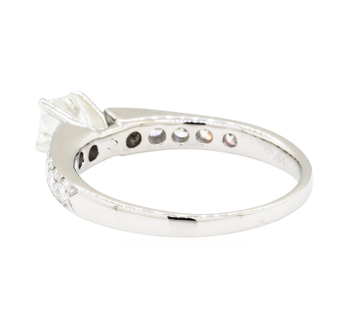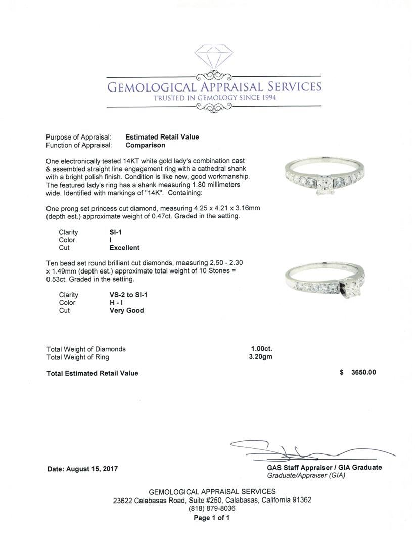 One electronically tested 14KT white gold lady's combination cast & assembled straight line engagement ring with a cathedral shank with a bright polish finish. The featured lady's ring has a shank measuring 1.80 millimeters wide. Identified with markings of '14K'. Condition is like new, good workmanship. Containing: One prong set princess cut diamond, measuring 4.25 x 4.21 x 3.16mm (depth est.) approximate weight of 0.47ct. Graded in the setting. Color I Clarity SI-1 Cut Excellent Ten bead set round brilliant cut diamonds, measuring 2.50 - 2.30 x 1.49mm (depth est.) approximate total weight of 10 Stones = 0.53ct. Graded in the setting. Color H - I Clarity VS-2 to SI-1 Cut Very Good. Total Weight of Diamonds 1.00ct.. Total Weight of Ring 3.20gm GAS Appraised at $3650.00. GAS Appraised at $3,650.00.
