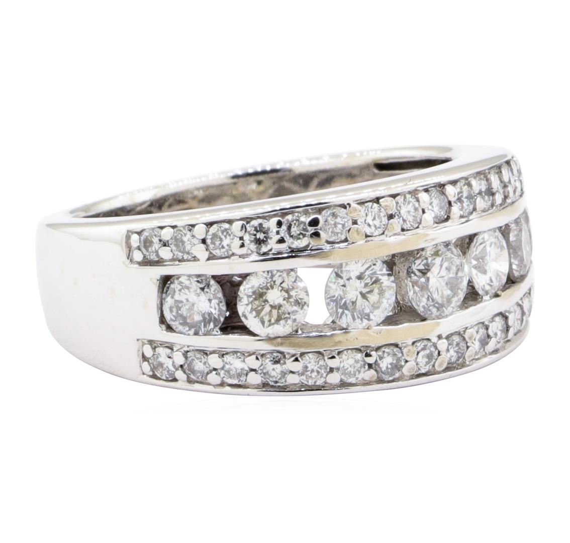 One electronically tested 14KT white gold lady's cast fashion ring with a three row tapered shank with a bright polish finish. The featured lady's ring has a shank measuring 3.20 millimeters wide. Condition is Good. Containing: One channel set round brilliant cut diamond, measuring 3.40 - 3.35 x 2.10mm (depth est.) approximate weight of 0.15ct. Graded in the setting. Color H Clarity I-1 Cut Good Six channel set round brilliant cut diamonds, measuring 3.00 - 2.90 x 1.83mm (depth est.) approximate total weight of 6 Stones = 0.60ct. Graded in the setting. Color H - I Clarity SI-1 to SI-2 Cut Very Good Thirty-Two prong set round brilliant cut diamonds, measuring 1.30 - 1.25 x 0.79mm (depth est.) approximate total weight of 32 Stones = 0.25ct. Graded in the setting. Color H - I Clarity SI-1 to I-1 Cut Good. Total Weight of Diamonds 1.00ct.. Total Weight of Ring 4.70gm GAS Appraised at $3425.00. GAS Appraised at $3,425.00.