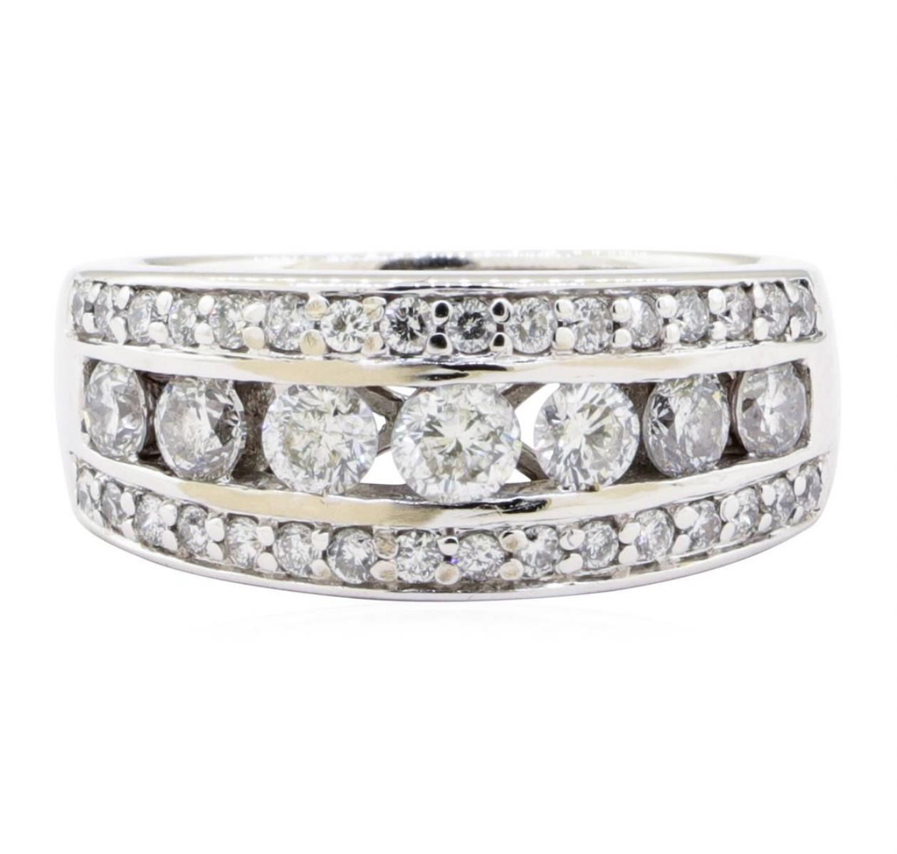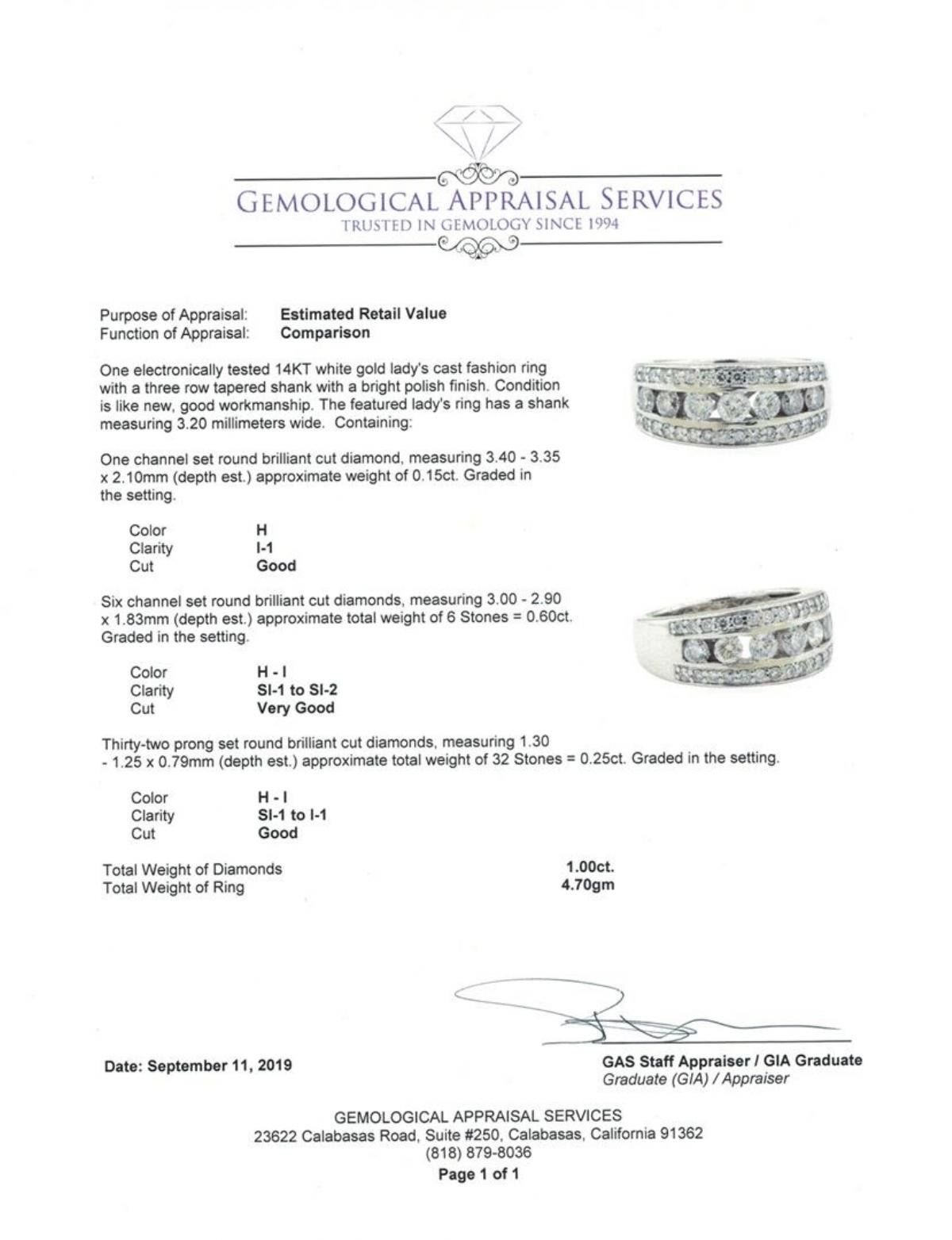 One electronically tested 14KT white gold lady's cast fashion ring with a three row tapered shank with a bright polish finish. The featured lady's ring has a shank measuring 3.20 millimeters wide. Condition is Good. Containing: One channel set round brilliant cut diamond, measuring 3.40 - 3.35 x 2.10mm (depth est.) approximate weight of 0.15ct. Graded in the setting. Color H Clarity I-1 Cut Good Six channel set round brilliant cut diamonds, measuring 3.00 - 2.90 x 1.83mm (depth est.) approximate total weight of 6 Stones = 0.60ct. Graded in the setting. Color H - I Clarity SI-1 to SI-2 Cut Very Good Thirty-Two prong set round brilliant cut diamonds, measuring 1.30 - 1.25 x 0.79mm (depth est.) approximate total weight of 32 Stones = 0.25ct. Graded in the setting. Color H - I Clarity SI-1 to I-1 Cut Good. Total Weight of Diamonds 1.00ct.. Total Weight of Ring 4.70gm GAS Appraised at $3425.00. GAS Appraised at $3,425.00.