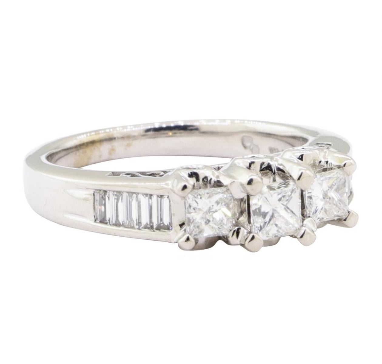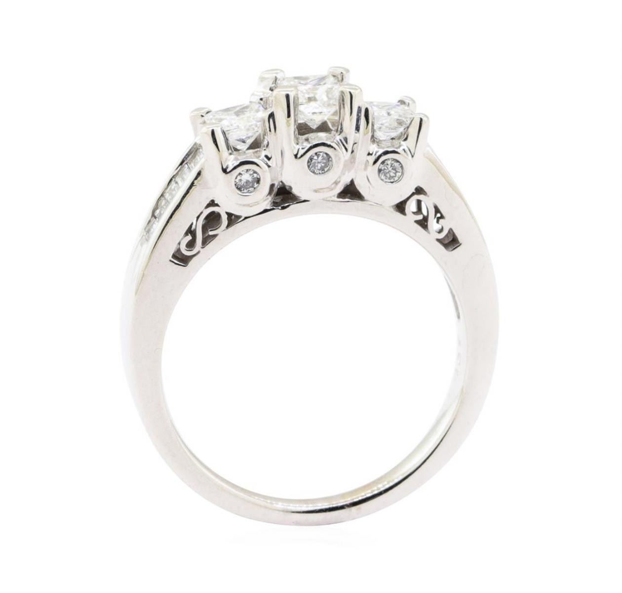 One electronically tested 14KT white gold lady's cast wedding ring with a three stone cathedral motif with a bright polish finish. The featured lady's ring has a shank measuring 2.35 millimeters wide. Identified with markings of '14K'. Condition is new, good workmanship. Containing: Three prong set princess cut diamonds, measuring 3.61 x 3.30 x 2.48mm (depth est.) approximate total weight of 3 Stones = 0.70ct. Graded in the setting. Color H - I Clarity SI-1 to SI-2 Cut Very Good Ten channel set baguette cut diamonds, measuring from 2.30 x 1.10 x 0.94mm (depth est.) to 2.40 x 1.20 x 1.02mm (depth est.) approximate total weight of 10 Stones = 0.24ct. Graded in the setting. Color G - H Clarity VS-2 to SI-1 Cut Very Good Six bezel set round brilliant cut diamonds, measuring 1.40 - 1.35 x 0.86mm (depth est.) approximate total weight of 6 Stones = 0.06ct. Graded in the setting. Color H - I Clarity SI-1 to SI-2 Cut Very Good. Total Weight of Diamonds 1.00ct.. Total Weight of Ring 6.20gm GAS Appraised at $4175.00. GAS Appraised.