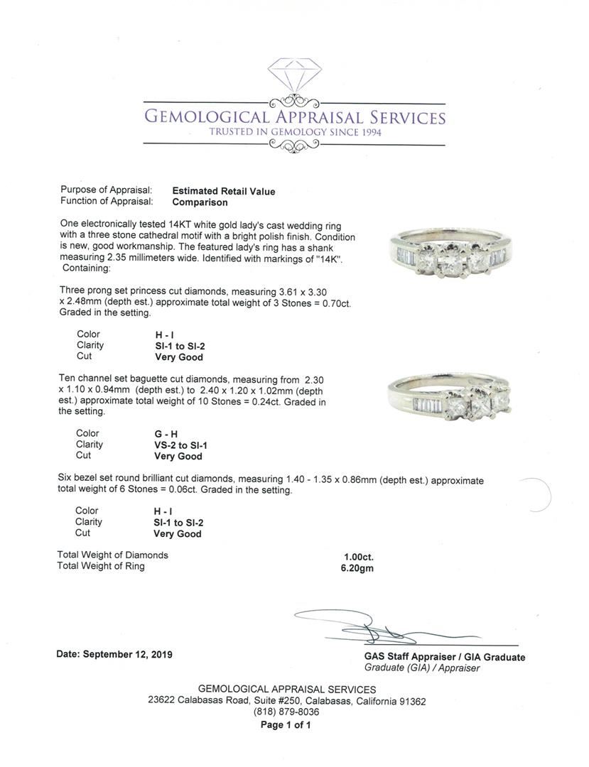 One electronically tested 14KT white gold lady's cast wedding ring with a three stone cathedral motif with a bright polish finish. The featured lady's ring has a shank measuring 2.35 millimeters wide. Identified with markings of '14K'. Condition is new, good workmanship. Containing: Three prong set princess cut diamonds, measuring 3.61 x 3.30 x 2.48mm (depth est.) approximate total weight of 3 Stones = 0.70ct. Graded in the setting. Color H - I Clarity SI-1 to SI-2 Cut Very Good Ten channel set baguette cut diamonds, measuring from 2.30 x 1.10 x 0.94mm (depth est.) to 2.40 x 1.20 x 1.02mm (depth est.) approximate total weight of 10 Stones = 0.24ct. Graded in the setting. Color G - H Clarity VS-2 to SI-1 Cut Very Good Six bezel set round brilliant cut diamonds, measuring 1.40 - 1.35 x 0.86mm (depth est.) approximate total weight of 6 Stones = 0.06ct. Graded in the setting. Color H - I Clarity SI-1 to SI-2 Cut Very Good. Total Weight of Diamonds 1.00ct.. Total Weight of Ring 6.20gm GAS Appraised at $4175.00. GAS Appraised.