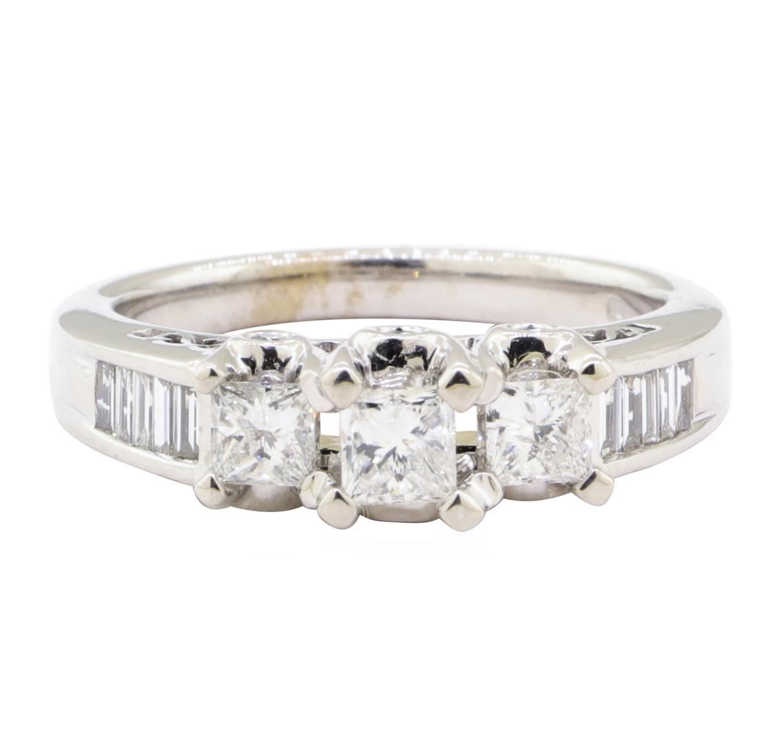 One electronically tested 14KT white gold lady's cast wedding ring with a three stone cathedral motif with a bright polish finish. The featured lady's ring has a shank measuring 2.35 millimeters wide. Identified with markings of '14K'. Condition is new, good workmanship. Containing: Three prong set princess cut diamonds, measuring 3.61 x 3.30 x 2.48mm (depth est.) approximate total weight of 3 Stones = 0.70ct. Graded in the setting. Color H - I Clarity SI-1 to SI-2 Cut Very Good Ten channel set baguette cut diamonds, measuring from 2.30 x 1.10 x 0.94mm (depth est.) to 2.40 x 1.20 x 1.02mm (depth est.) approximate total weight of 10 Stones = 0.24ct. Graded in the setting. Color G - H Clarity VS-2 to SI-1 Cut Very Good Six bezel set round brilliant cut diamonds, measuring 1.40 - 1.35 x 0.86mm (depth est.) approximate total weight of 6 Stones = 0.06ct. Graded in the setting. Color H - I Clarity SI-1 to SI-2 Cut Very Good. Total Weight of Diamonds 1.00ct.. Total Weight of Ring 6.20gm GAS Appraised at $4175.00. GAS Appraised.