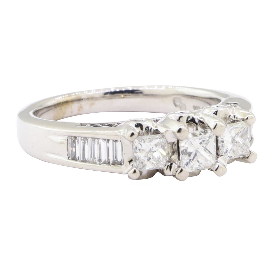 One electronically tested 14KT white gold lady's cast wedding ring with a three stone cathedral motif with a bright polish finish. The featured lady's ring has a shank measuring 2.35 millimeters wide. Identified with markings of '14K'. Condition is new, good workmanship. Containing: Three prong set princess cut diamonds, measuring 3.61 x 3.30 x 2.48mm (depth est.) approximate total weight of 3 Stones = 0.70 ct. Graded in the setting. Color H - I Clarity SI-1 to SI-2 Cut Very Good Ten channel set baguette cut diamonds, measuring from 2.30 x 1.10 x 0.94mm (depth est.) to 2.40 x 1.20 x 1.02mm (depth est.) approximate total weight of 10 Stones = 0.24ct. Graded in the setting. Color G - H Clarity VS-2 to SI-1 Cut Very Good Six bezel set round brilliant cut diamonds, measuring 1.40 - 1.35 x 0.86mm (depth est.) approximate total weight of 6 Stones = 0.06ct. Graded in the setting. Color H - I Clarity SI-1 to SI-2 Cut Very Good. Total Weight of Diamonds 1.00 ct.. Total Weight of Ring 6.20gm GAS Appraised at $4175.00. GAS Appraised.