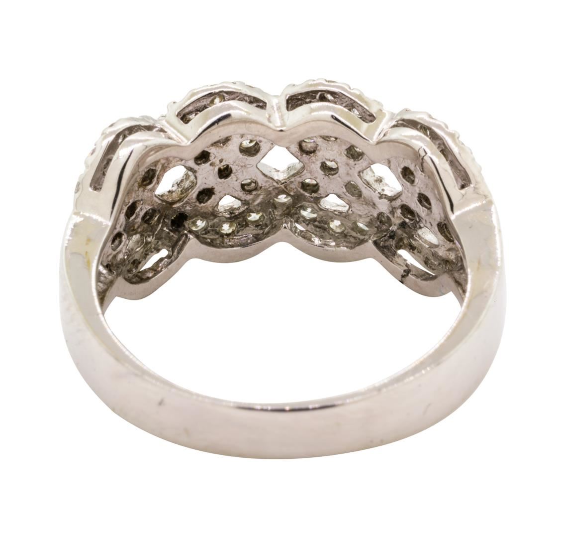 One electronically tested 14KT white gold lady's cast fashion ring with a four row braided motif with a bright polish finish. The featured lady's ring has a shank measuring 3.20 millimeters wide. Identified with markings of '14K'. Condition is like new, good workmanship. Containing: Fifty-Four prong set round brilliant cut diamonds, measuring 1.70 - 1.65 x 1.08mm (depth est.) approximate total weight of 54 Stones = 1.00 ct. Graded in the setting. Color I - J Clarity VS-2 to SI-1 Cut Good. Total Weight of Diamonds 1.00 ct.. Total Weight of Ring 5.30gm GAS Appraised at $3125.00. GAS Appraised.