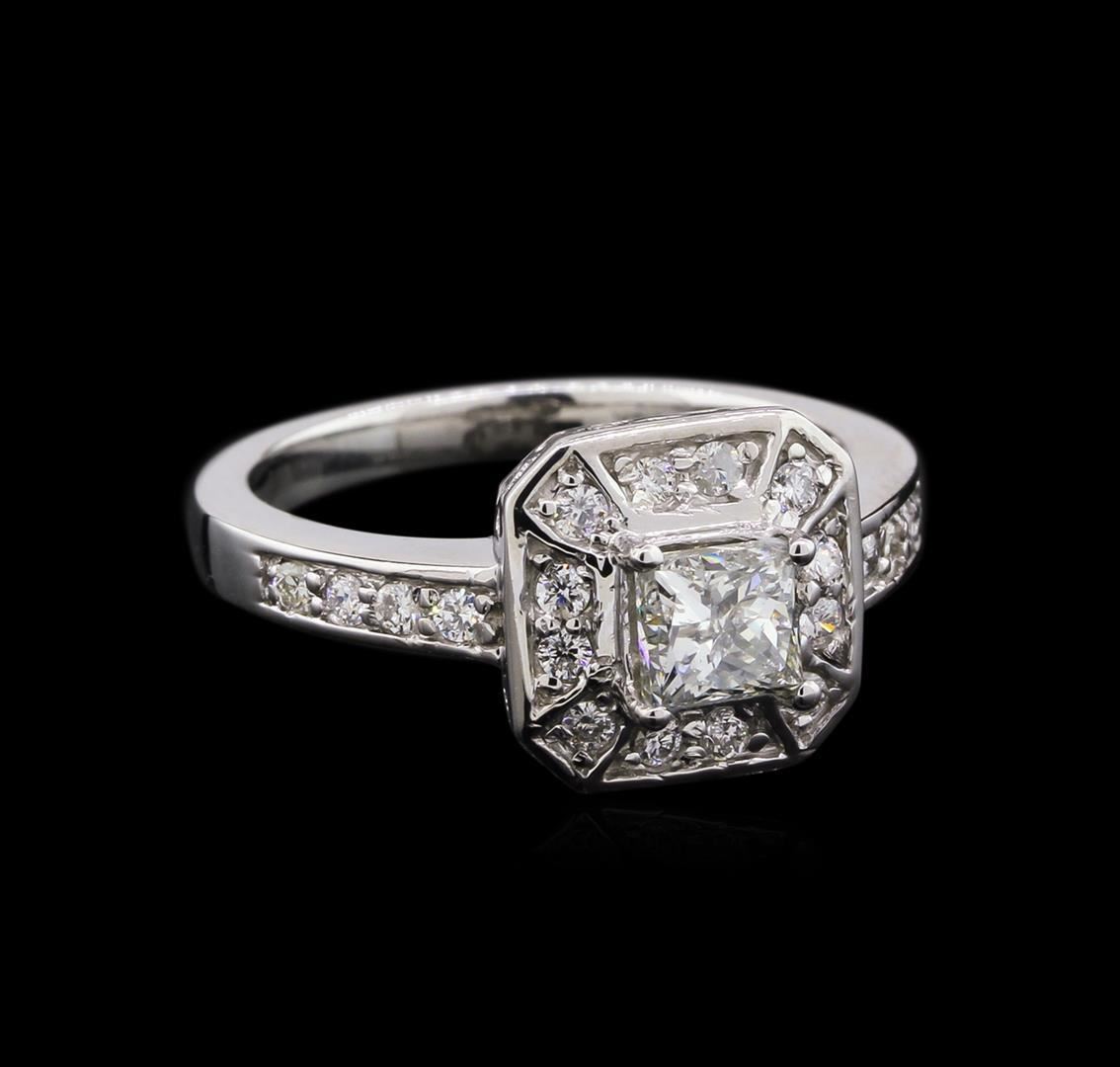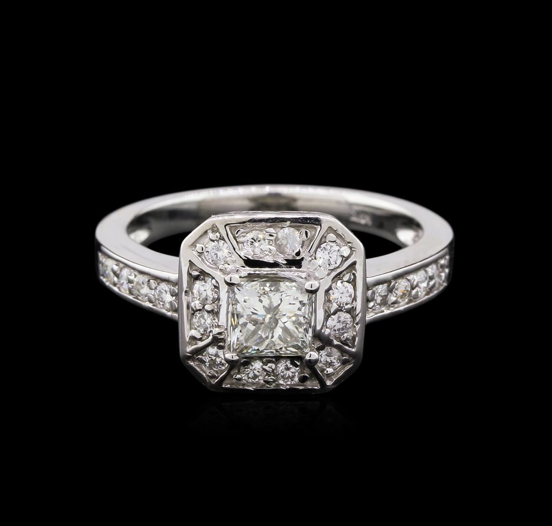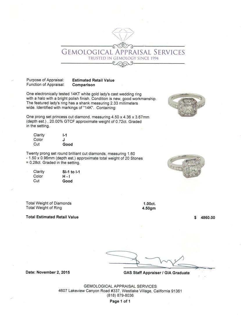 One electronically tested 14KT white gold lady's cast wedding ring with a halo with a bright polish finish. The featured lady's ring has a shank measuring 2.33 millimeters wide. Identified with markings of "14K". Condition is new, good workmanship. Containing: One prong set princess cut diamond, measuring 4.50 x 4.36 x 3.67mm (depth est.) , 20.00% GTCF approximate weight of 0.72ct. Graded in the setting. Clarity: I-1. Color: J. Cut: Good. Twenty prong set round brilliant cut diamonds, measuring 1.60 - 1.50 x 0.96mm (depth est.) approximate total weight of 20 Stones = 0.28ct. Graded in the setting. Clarity: SI-1 to I-1. Color: H - I. Cut: Good. Total Weight of Diamonds 1.00ct. Total Weight of Ring 4.50gm. GAS Appraised.
