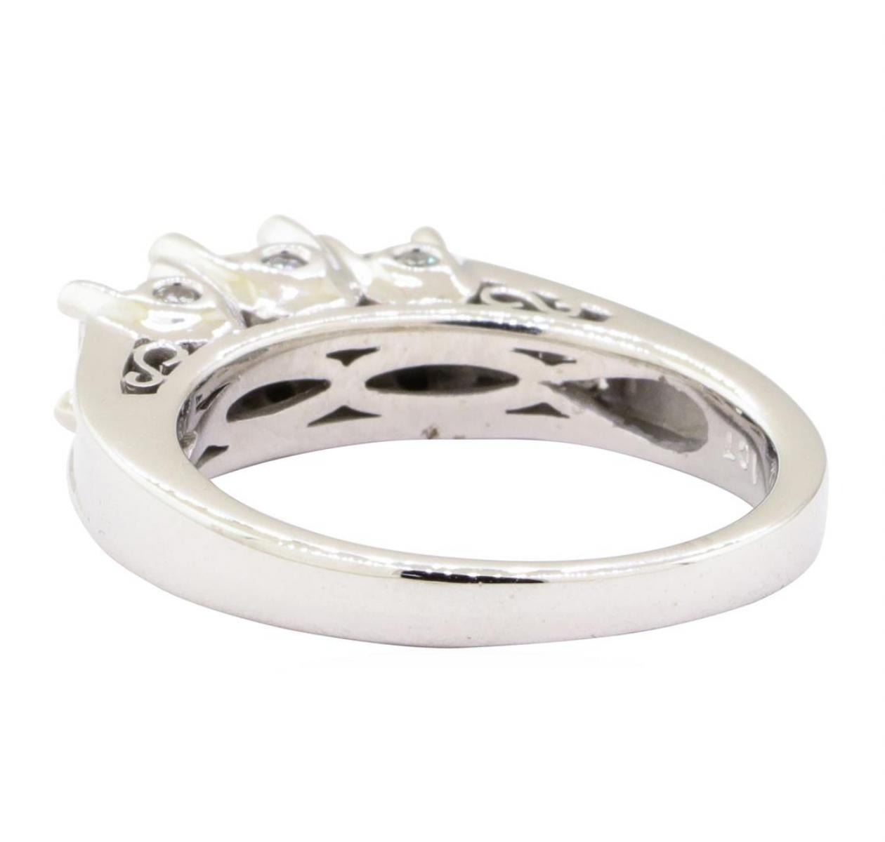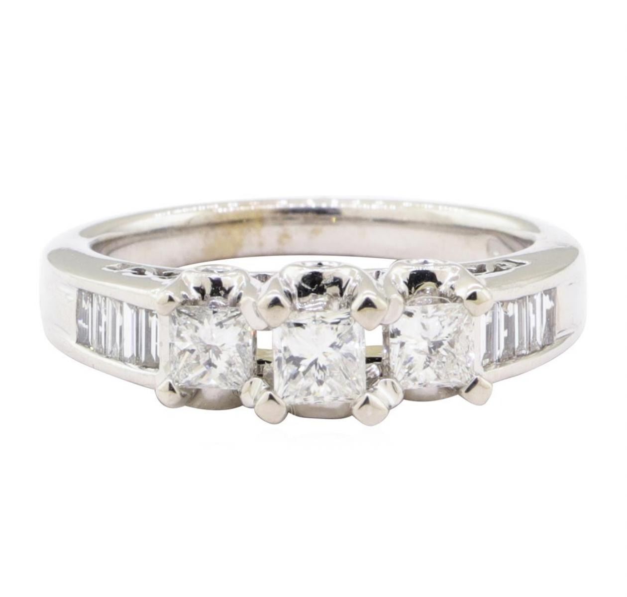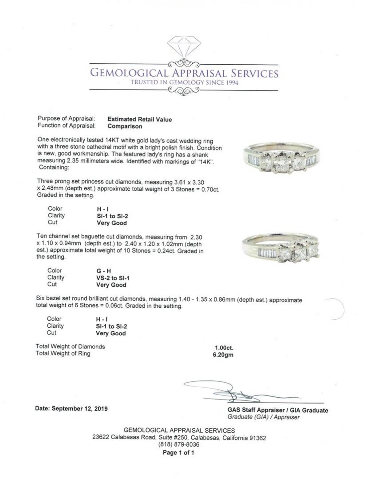 One electronically tested 14KT white gold lady's cast wedding ring with a three stone cathedral motif with a bright polish finish. The featured lady's ring has a shank measuring 2.35 millimeters wide. Identified with markings of '14K'. Condition is new, good workmanship. Containing: Three prong set princess cut diamonds, measuring 3.61 x 3.30 x 2.48mm (depth est.) approximate total weight of 3 Stones = 0.70 ct. Graded in the setting. Color H - I Clarity SI-1 to SI-2 Cut Very Good Ten channel set baguette cut diamonds, measuring from 2.30 x 1.10 x 0.94mm (depth est.) to 2.40 x 1.20 x 1.02mm (depth est.) approximate total weight of 10 Stones = 0.24ct. Graded in the setting. Color G - H Clarity VS-2 to SI-1 Cut Very Good Six bezel set round brilliant cut diamonds, measuring 1.40 - 1.35 x 0.86mm (depth est.) approximate total weight of 6 Stones = 0.06ct. Graded in the setting. Color H - I Clarity SI-1 to SI-2 Cut Very Good. Total Weight of Diamonds 1.00 ct.. Total Weight of Ring 6.20gm GAS Appraised at $4175.00. GAS Appraised.