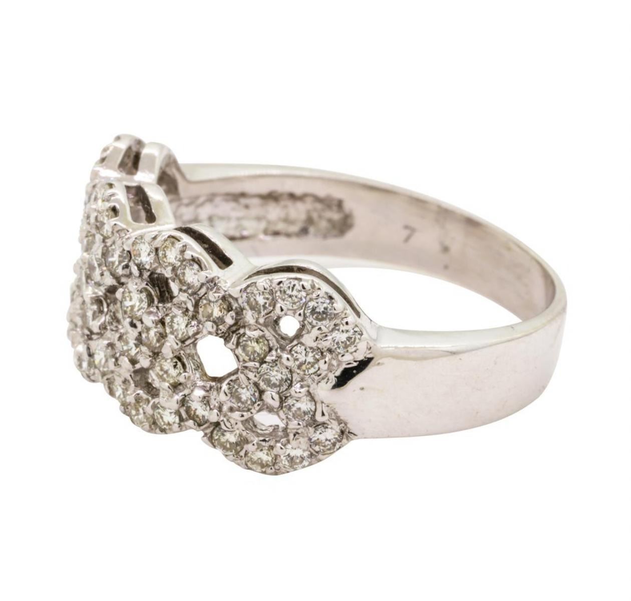 One electronically tested 14KT white gold lady's cast fashion ring with a four row braided motif with a bright polish finish. The featured lady's ring has a shank measuring 3.20 millimeters wide. Identified with markings of '14K'. Condition is like new, good workmanship. Containing: Fifty-Four prong set round brilliant cut diamonds, measuring 1.70 - 1.65 x 1.08mm (depth est.) approximate total weight of 54 Stones = 1.00 ct. Graded in the setting. Color I - J Clarity VS-2 to SI-1 Cut Good. Total Weight of Diamonds 1.00 ct.. Total Weight of Ring 5.30gm GAS Appraised at $3125.00. GAS Appraised.