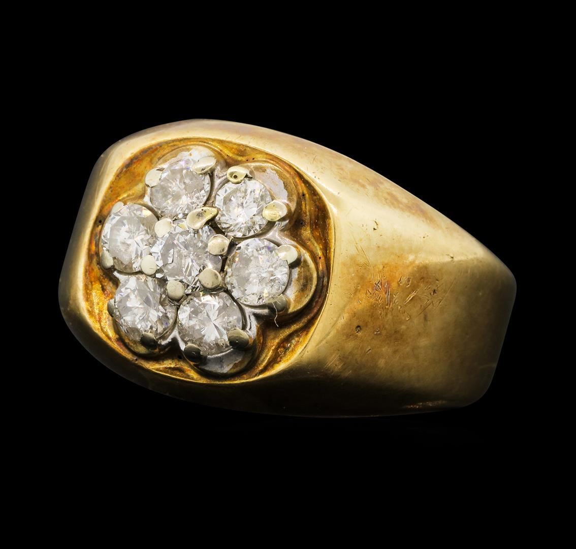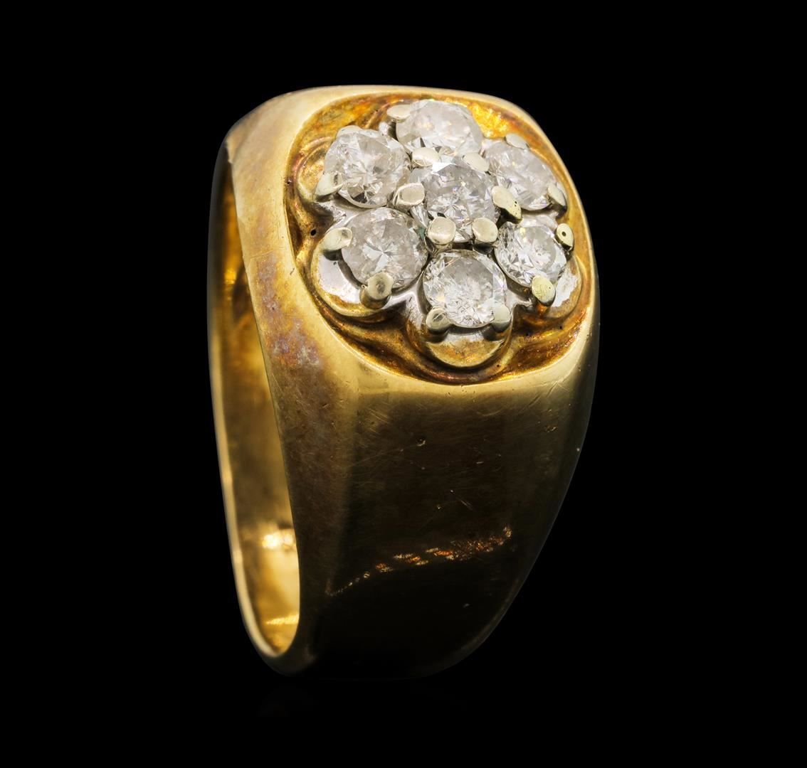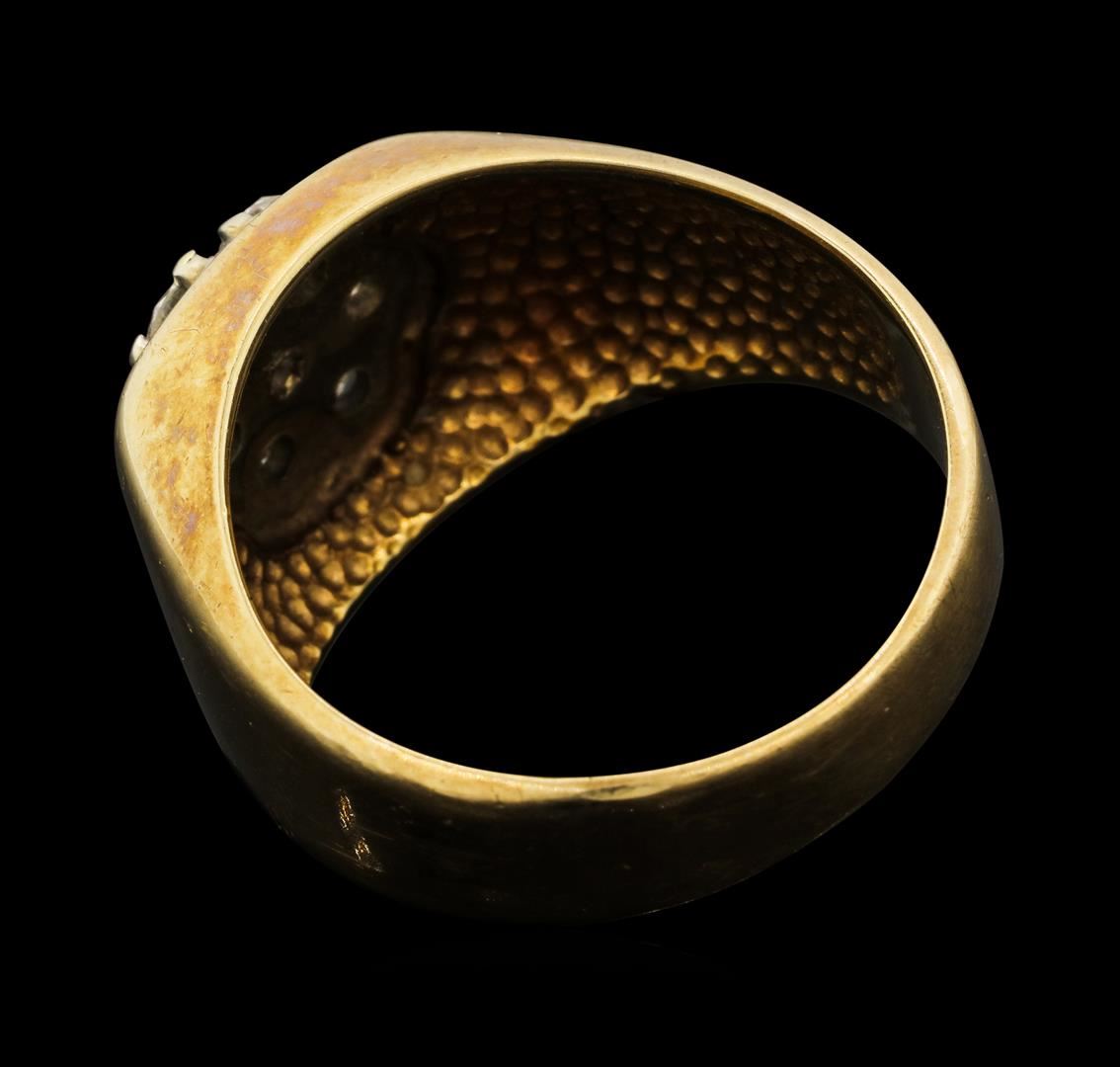 One electronically tested 14KT yellow and white gold man's combination cast & assembled fashion ring with a tapered wide band with a bright polish finish. The featured man's ring has a shank measuring 4.42 millimeters wide. Condition is used, good workman GAS Appraised at $2,540.00.