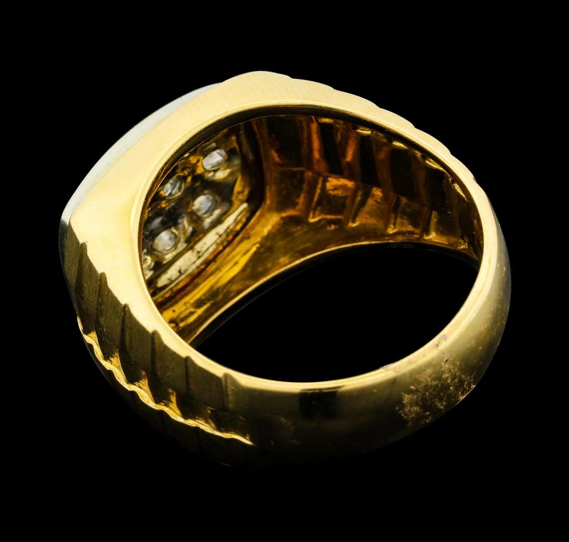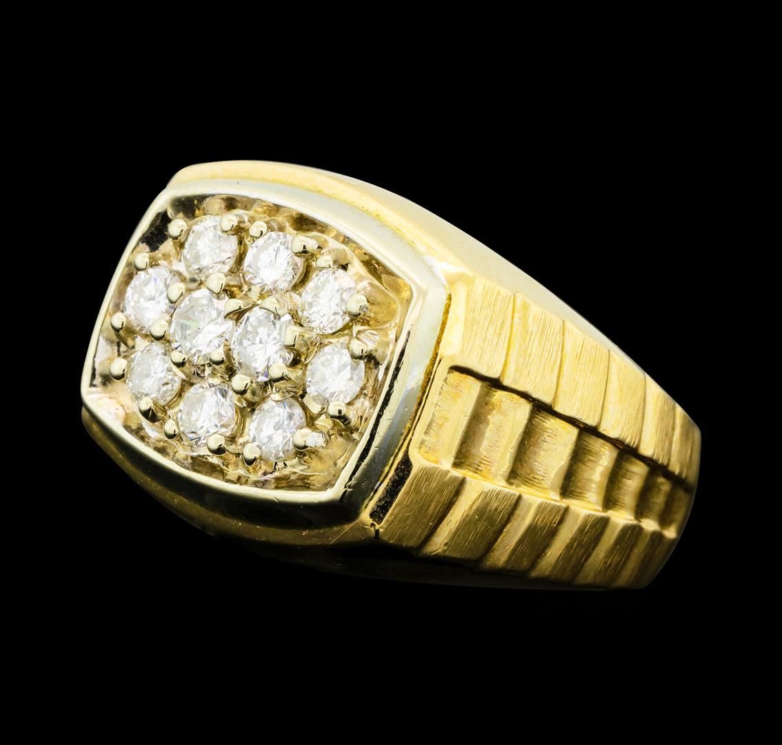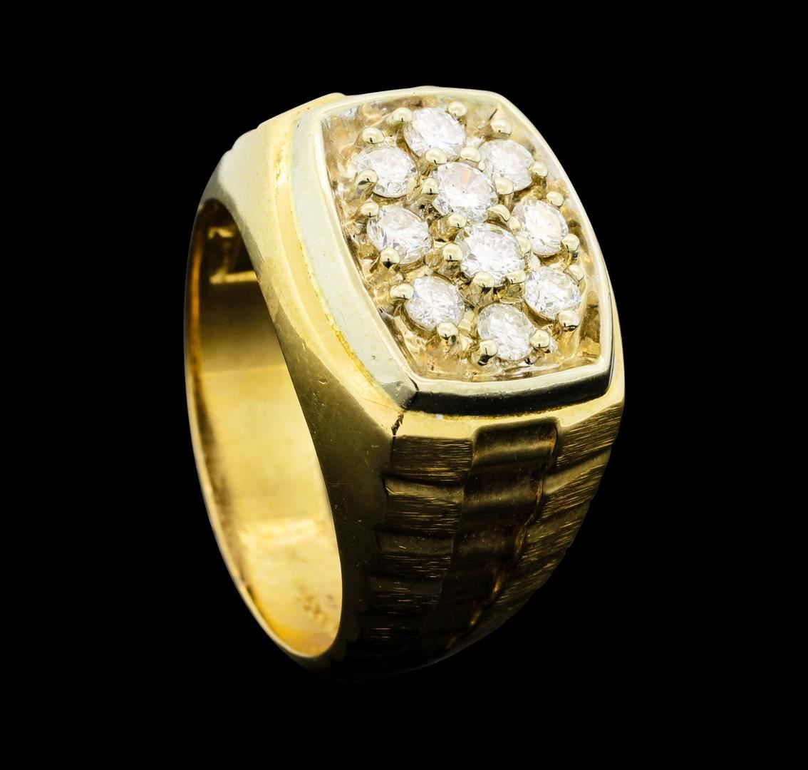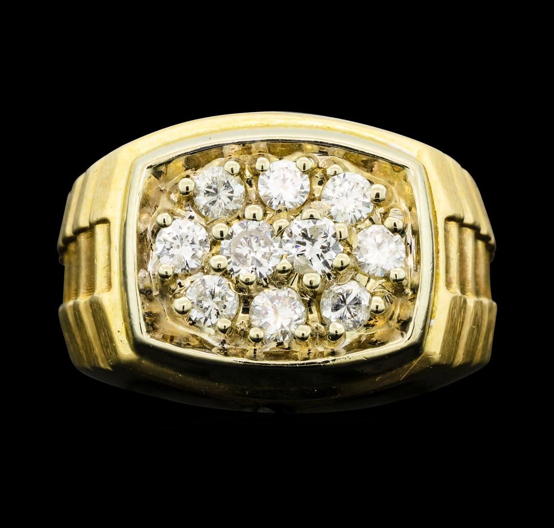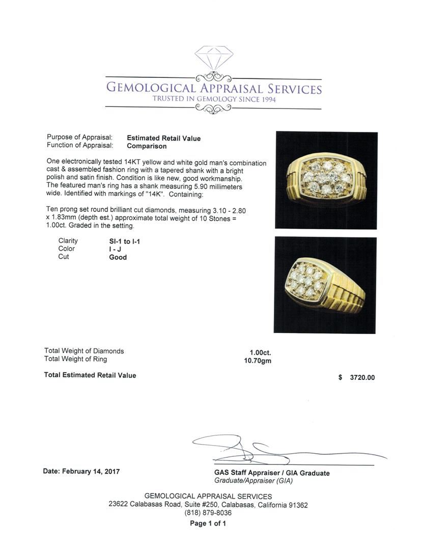 One electronically tested 14KT yellow and white gold man's combination cast & assembled fashion ring with a tapered shank with a bright polish and satin finish. The featured man's ring has a shank measuring 5.90 millimeters wide. Identified with markings of '14K'. Condition is like new, good workmanship. Containing: Ten prong set round brilliant cut diamonds, measuring 3.10 - 2.80 x 1.83mm (depth est.) approximate total weight of 10 Stones = 1.00ct. Graded in the setting. Clarity SI-1 to I-1. Color: I - J Cut Good. Total Weight of Diamonds 1.00ct.. Total Weight of Ring 10.70gm. GAS Appraised at $3,720.00.
