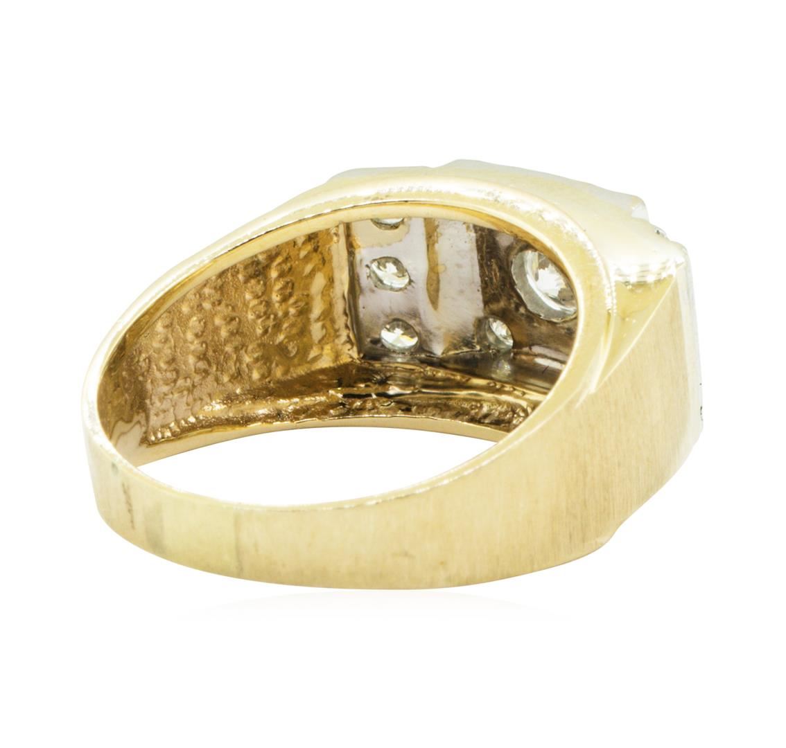One electronically tested 14KT yellow and white gold man's combination cast & assembled fashion ring with a rectangular top with a bright polish and satin finish. The featured men's ring has a shank measuring 3.70 millimeters in width. Identified with markings of '14K'. Condition is like new, good workmanship. Containing: One prong set round brilliant cut diamond, measuring 4.58 - 4.54 x 2.90mm (depth est.) approximate weight of 0.38ct. Graded in the setting. Color I Clarity SI-1 Cut Very Good Ten prong set round brilliant cut diamonds, measuring 2.70 - 2.40 x 1.49mm (depth est.) approximate total weight of 10 Stones = 0.62ct. Graded in the setting. Color H - J Clarity VS-2 to SI-1 Cut Very Good. Total Weight of Diamonds 1.00ct.. Total Weight of Ring 7.80gm GAS Appraised at $4210.00. GAS Appraised.