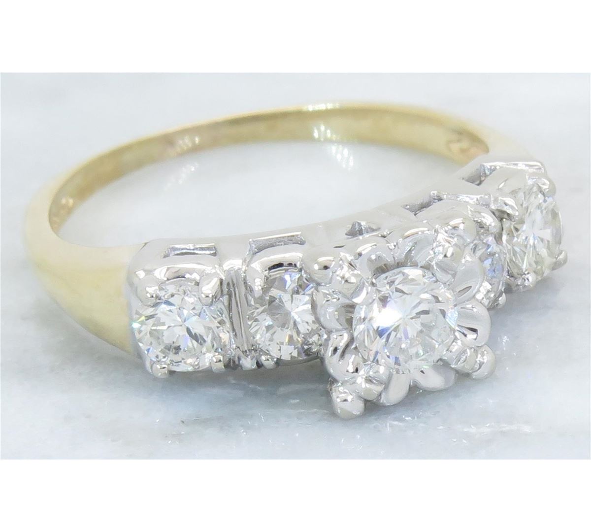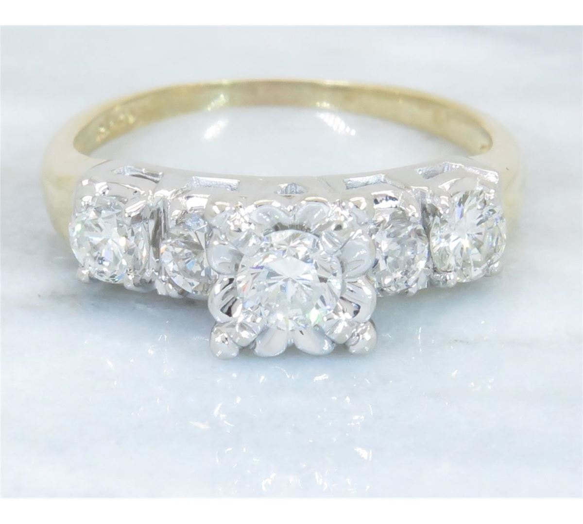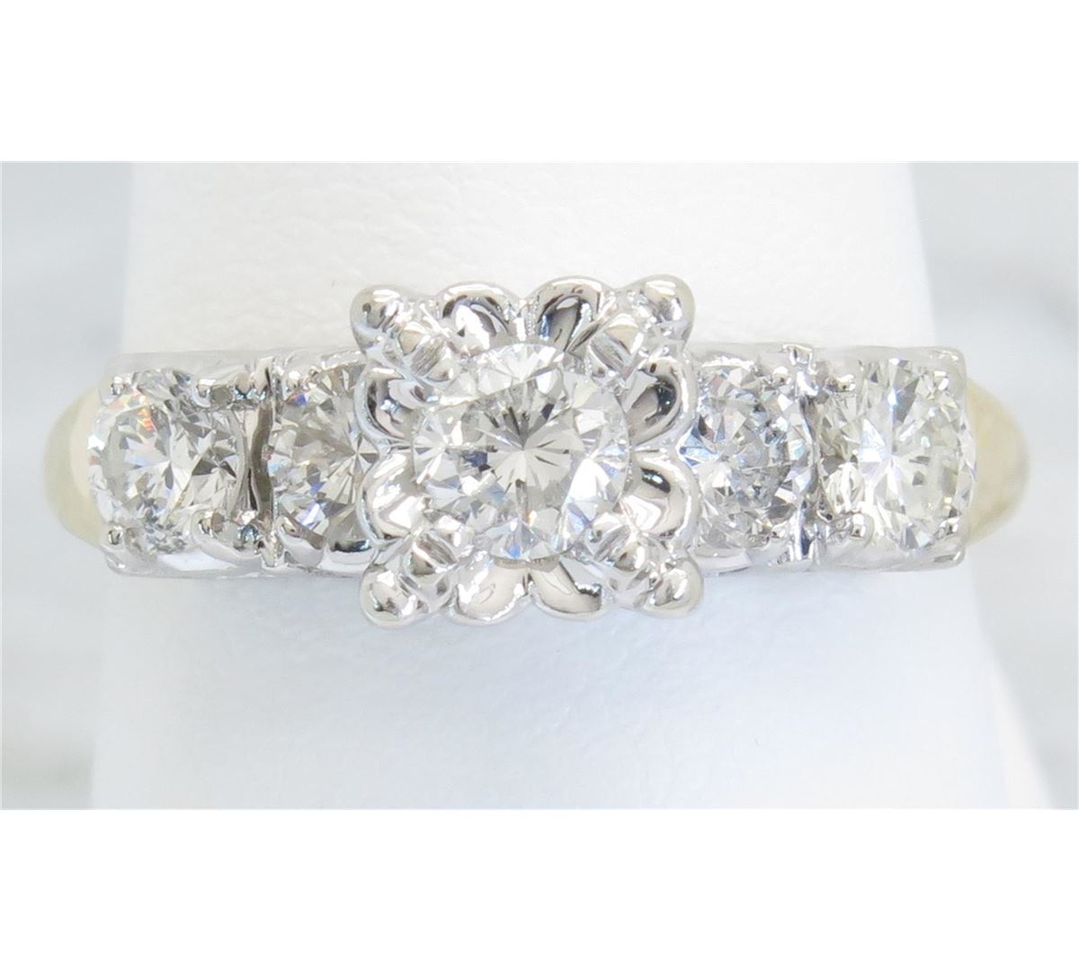 One tested 14K yellow gold diamond ring. Containing: Five Round Brilliant Cut Diamonds. Approximate total diamond weight: 1.00CTW. Diamonds are graded in the mounting, unless otherwise stated. Weight: 3.4 grams, Size: 7.25.