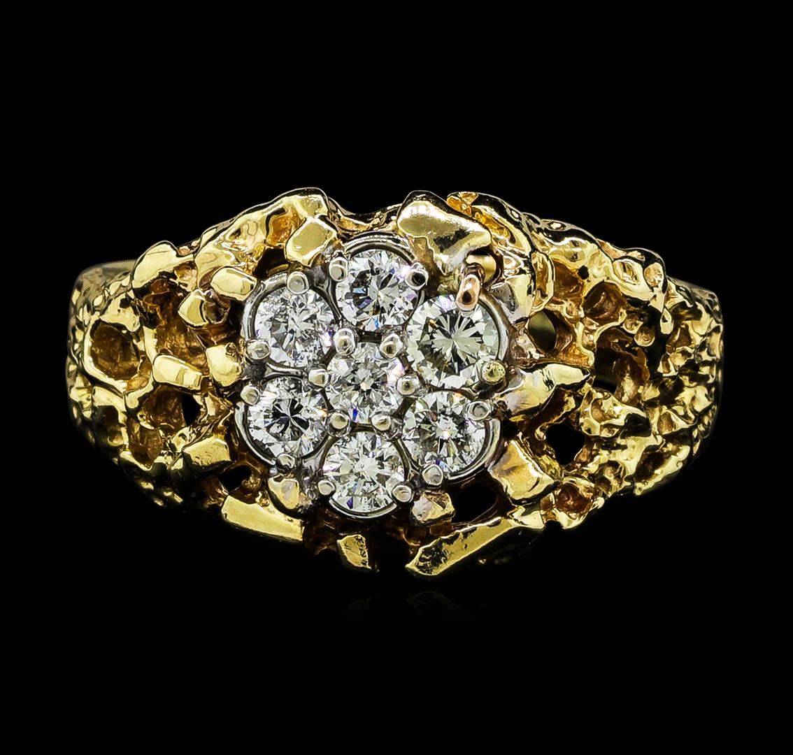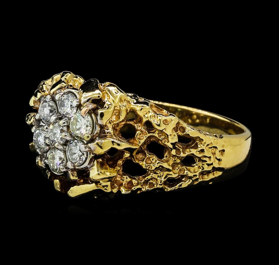 One electronically tested 14KT yellow gold gents cast & assembled diamond cluster ring. The ring features a diamond cluster set within a white gold plate supported by nugget patterned lattice tapering shoulders, completed by a four millimeter wide band. Bright and patterned finish. Trademark is MAGIC GLO. Identified with markings of '14K'. Condition is good. Containing: Six prong set round brilliant cut diamonds, measuring 3.70 - 3.20 x 2.07mm (depth est.) approximate total weight of 6 Stones = 1.00ct. Color grade is an average for the group. Graded in the setting. Clarity SI-1 to I-1. Color: G - I. Total Weight of Diamonds 1.00ct.. Total Weight of Ring 12.40gm. AIG Appraised at $5,150.00.