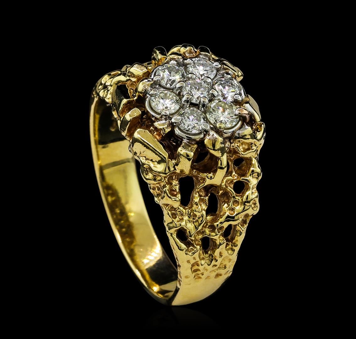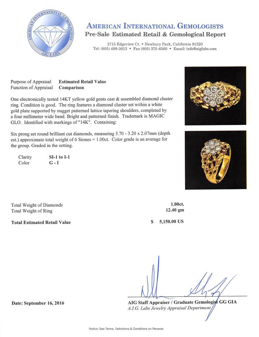 One electronically tested 14KT yellow gold gents cast & assembled diamond cluster ring. The ring features a diamond cluster set within a white gold plate supported by nugget patterned lattice tapering shoulders, completed by a four millimeter wide band. Bright and patterned finish. Trademark is MAGIC GLO. Identified with markings of '14K'. Condition is good. Containing: Six prong set round brilliant cut diamonds, measuring 3.70 - 3.20 x 2.07mm (depth est.) approximate total weight of 6 Stones = 1.00ct. Color grade is an average for the group. Graded in the setting. Clarity SI-1 to I-1. Color: G - I. Total Weight of Diamonds 1.00ct.. Total Weight of Ring 12.40gm. AIG Appraised at $5,150.00.