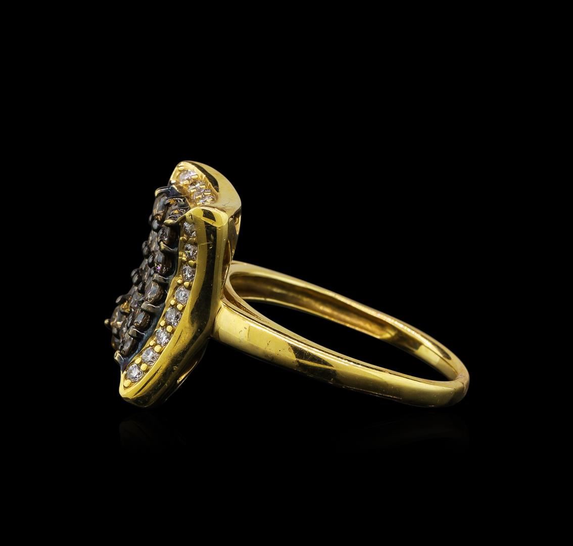 One electronically tested 14KT yellow gold ladies cast diamond ring with a bright and anodized finish. The ring features an organized diamond cluster set within a stylized diamond bezel supported by a lattice under gallery, completed by a one and one-half millimeter wide band. Identified with markings of '14K'. Condition is good. Containing: Twenty prong set round brilliant cut diamonds, measuring 2.10 - 2.00 x 1.23mm (depth est.) approximate total weight of 20 Stones = 0.71ct. Color grade is an average for the group. Graded in the setting. Clarity SI-2 to I-2 Thirty bead set round brilliant cut diamonds, measuring 1.30 - 1.30 x 0.78mm (depth est.) approximate total weight of 30 Stones = 0.29ct. Graded in the setting. Clarity I-1 to I-2. Color: G - H. Total Weight of Diamonds 1.00ct.. Total Weight of Ring 5.03gm. AIG Appraised at $3,145.00.