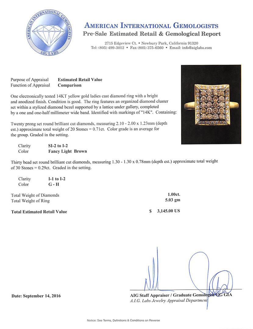 One electronically tested 14KT yellow gold ladies cast diamond ring with a bright and anodized finish. The ring features an organized diamond cluster set within a stylized diamond bezel supported by a lattice under gallery, completed by a one and one-half millimeter wide band. Identified with markings of '14K'. Condition is good. Containing: Twenty prong set round brilliant cut diamonds, measuring 2.10 - 2.00 x 1.23mm (depth est.) approximate total weight of 20 Stones = 0.71ct. Color grade is an average for the group. Graded in the setting. Clarity SI-2 to I-2 Thirty bead set round brilliant cut diamonds, measuring 1.30 - 1.30 x 0.78mm (depth est.) approximate total weight of 30 Stones = 0.29ct. Graded in the setting. Clarity I-1 to I-2. Color: G - H. Total Weight of Diamonds 1.00ct.. Total Weight of Ring 5.03gm. AIG Appraised.