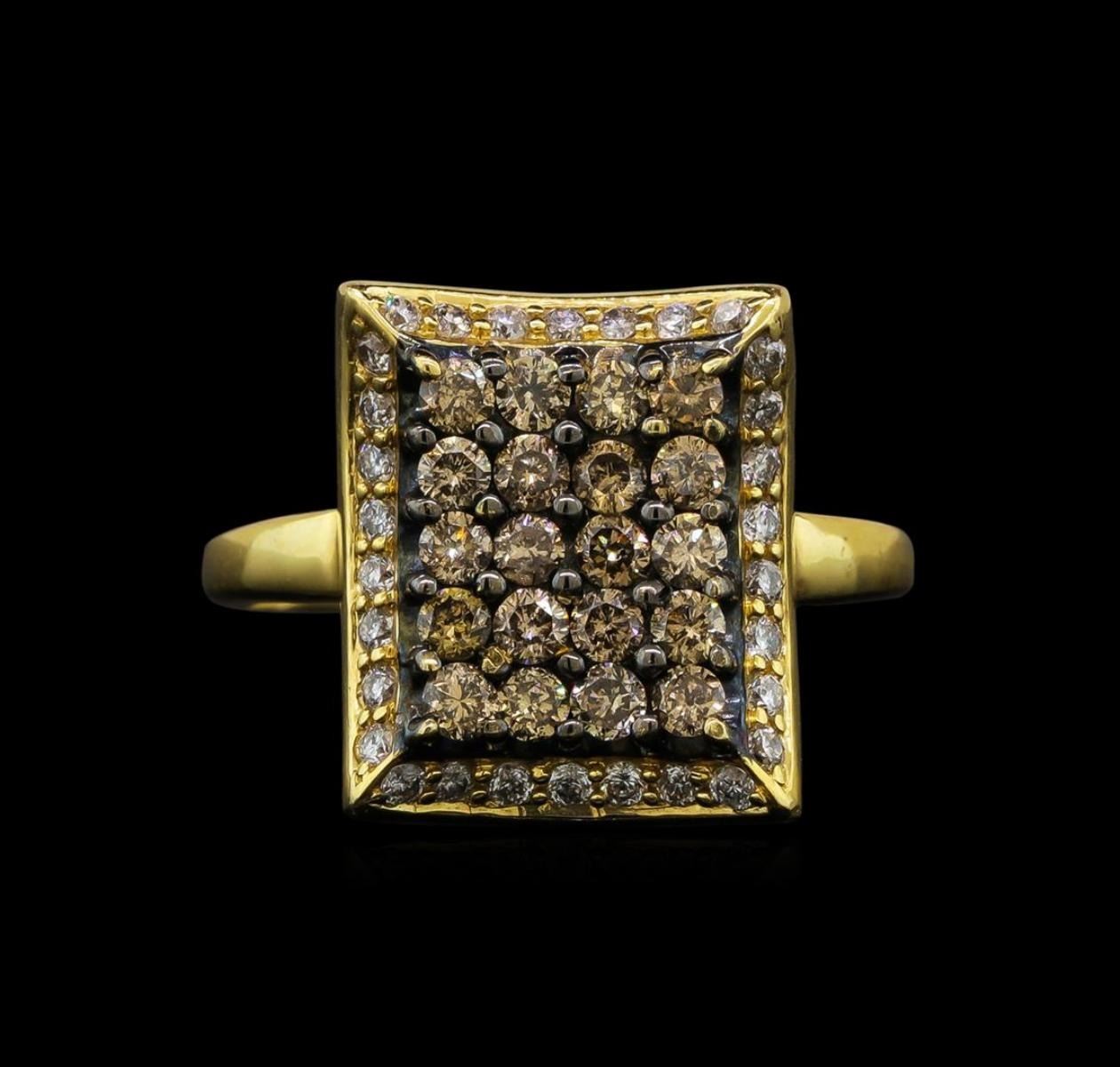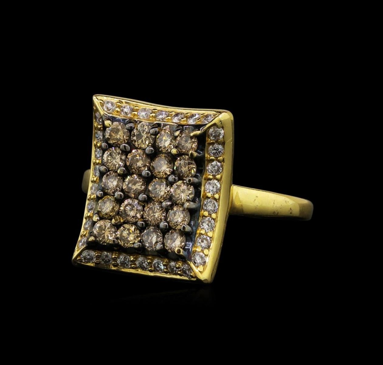 One electronically tested 14KT yellow gold ladies cast diamond ring with a bright and anodized finish. The ring features an organized diamond cluster set within a stylized diamond bezel supported by a lattice under gallery, completed by a one and one-half millimeter wide band. Identified with markings of '14K'. Condition is good. Containing: Twenty prong set round brilliant cut diamonds, measuring 2.10 - 2.00 x 1.23mm (depth est.) approximate total weight of 20 Stones = 0.71ct. Color grade is an average for the group. Graded in the setting. Clarity SI-2 to I-2 Thirty bead set round brilliant cut diamonds, measuring 1.30 - 1.30 x 0.78mm (depth est.) approximate total weight of 30 Stones = 0.29ct. Graded in the setting. Clarity I-1 to I-2. Color: G - H. Total Weight of Diamonds 1.00 ct.. Total Weight of Ring 5.03gm. AIG Appraised.
