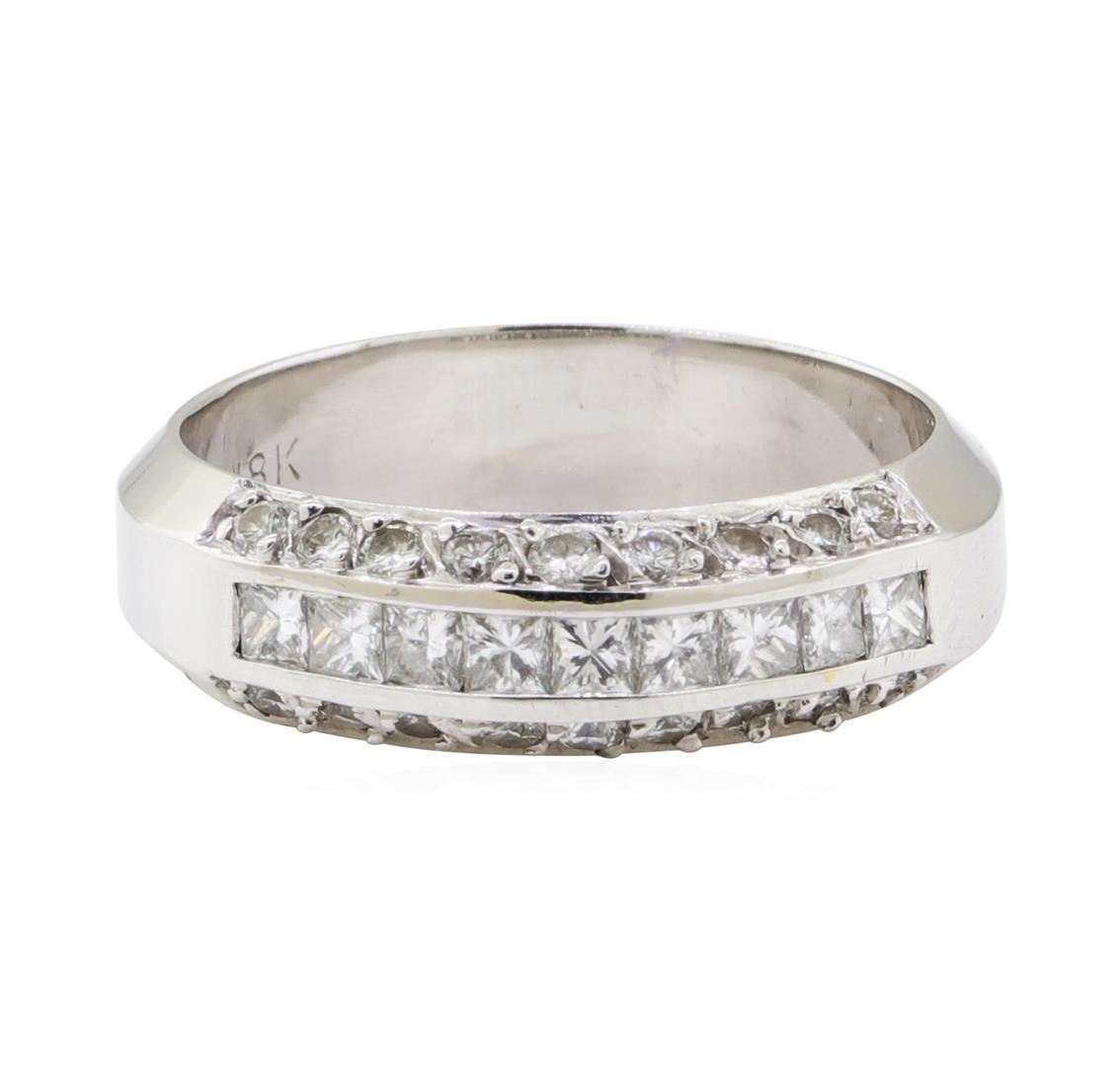 One beveled edge band featuring: 18KT white gold weighing 5.3 grams containing princess cut and round diamonds weighing 1.00ctw.