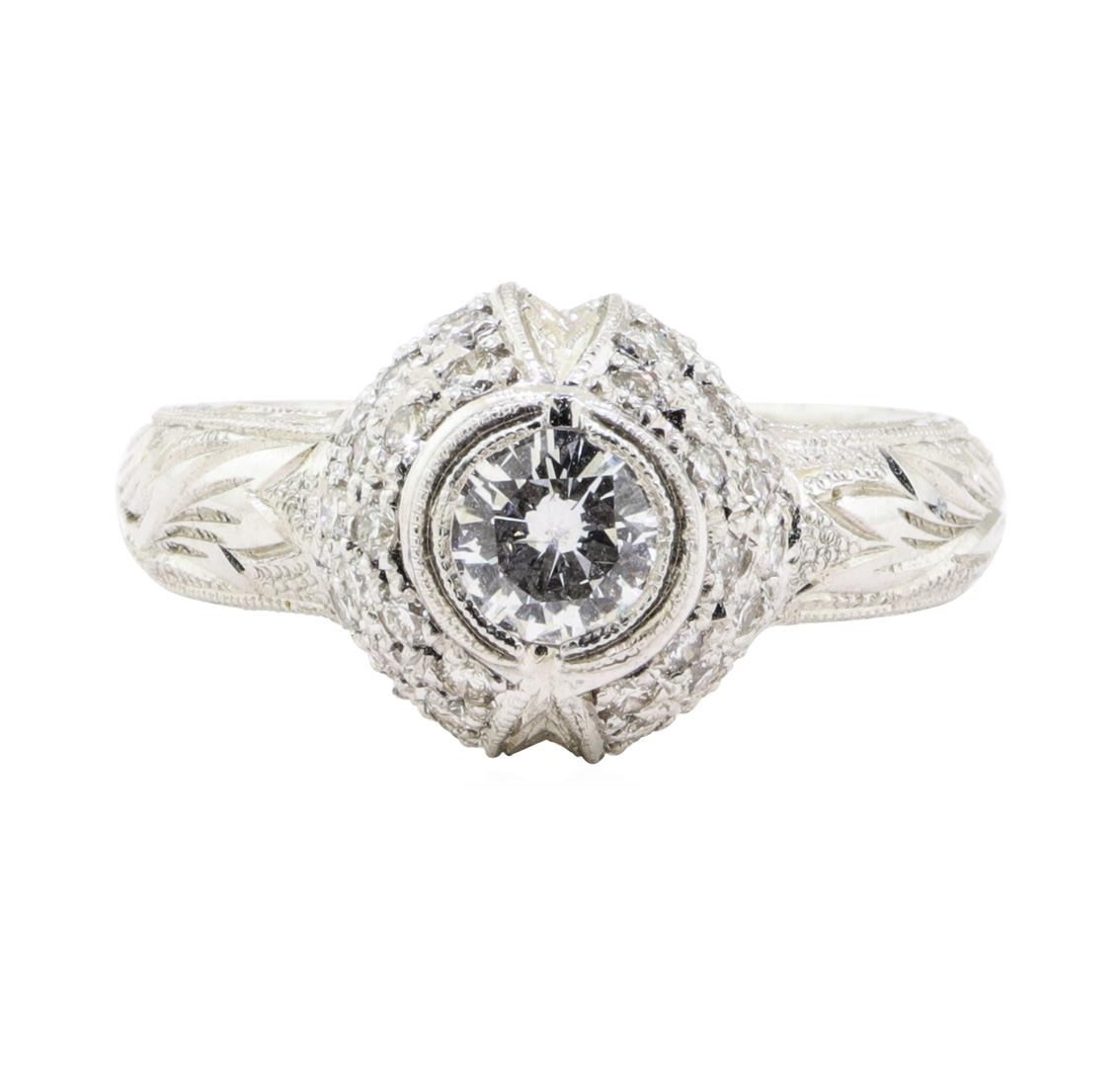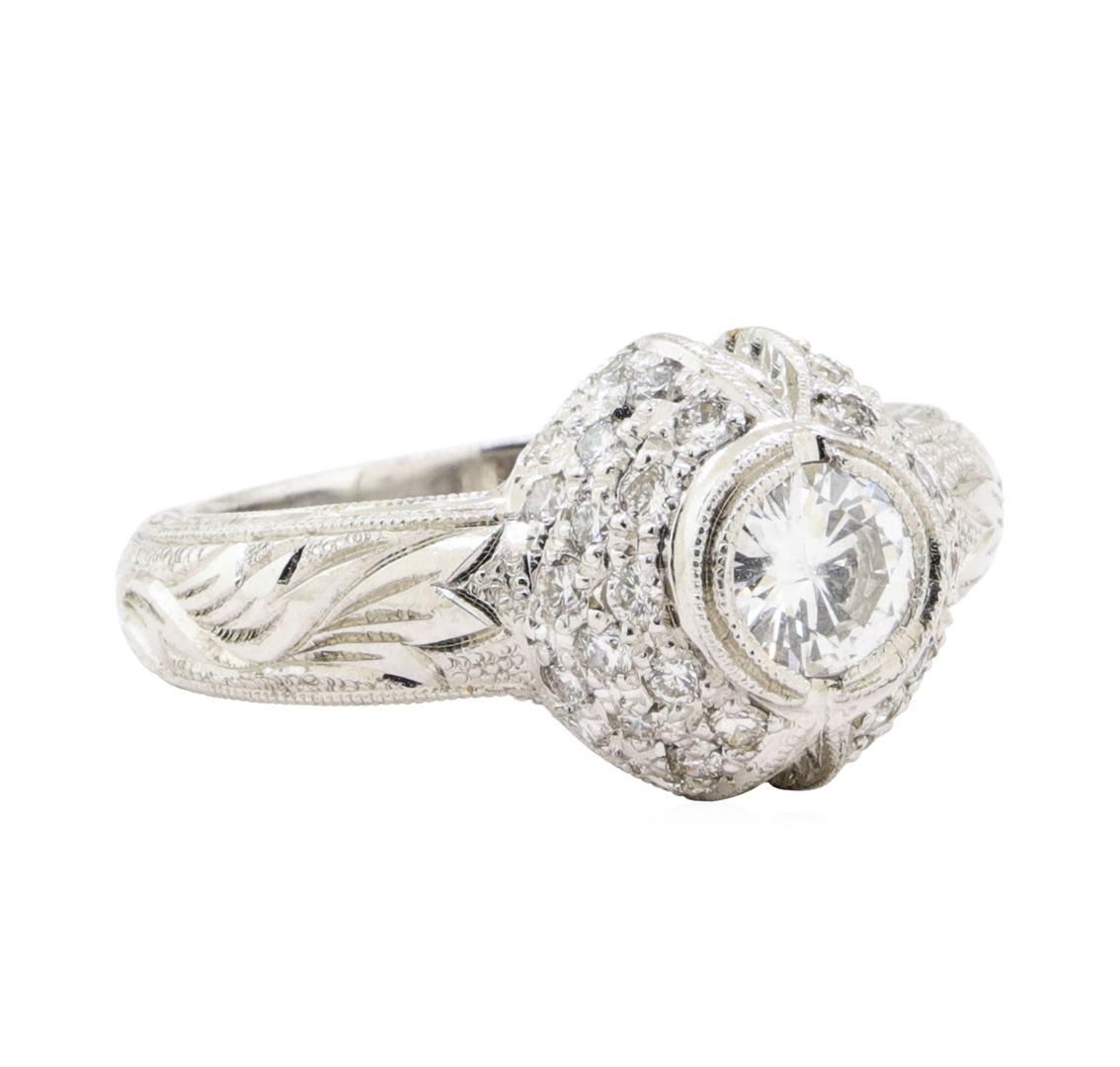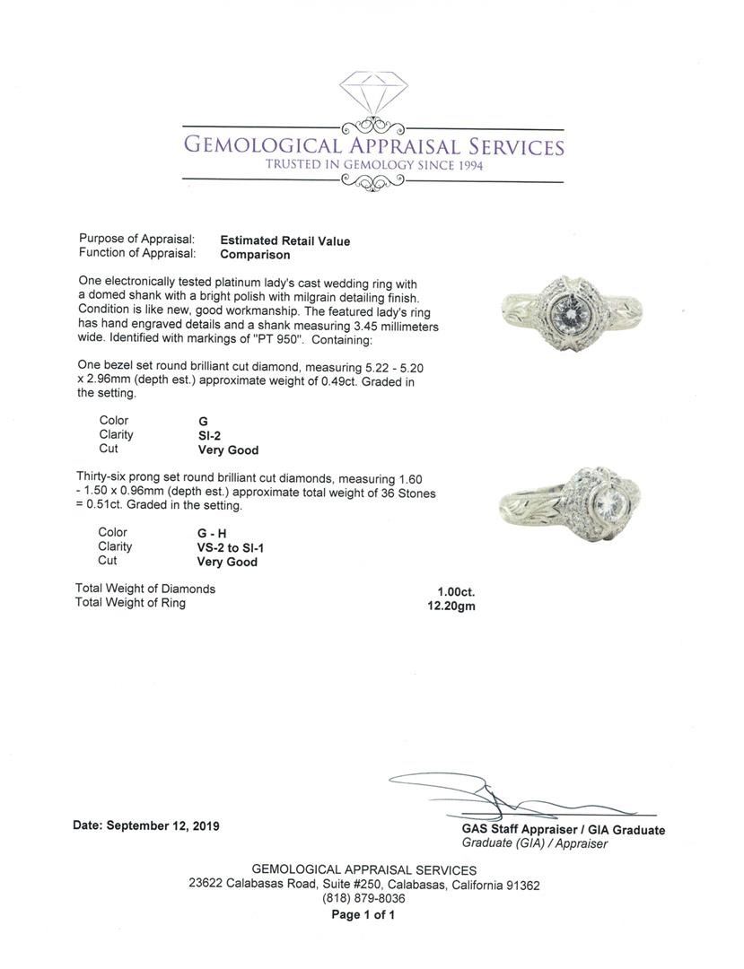 One electronically tested platinum lady's cast wedding ring with a domed shank with a bright polish with milgrain detailing finish. The featured lady's ring has hand engraved details and a shank measuring 3.45 millimeters wide. Identified with markings of 'PT 950'. Condition is Good. Containing: One bezel set round brilliant cut diamond, measuring 5.22 - 5.20 x 2.96mm (depth est.) approximate weight of 0.49ct. Graded in the setting. Color G Clarity SI-2 Cut Very Good Thirty-Six prong set round brilliant cut diamonds, measuring 1.60 - 1.50 x 0.96mm (depth est.) approximate total weight of 36 Stones = 0.51ct. Graded in the setting. Color G - H Clarity VS-2 to SI-1 Cut Very Good. Total Weight of Diamonds 1.00 ct.. Total Weight of Ring 12.20gm GAS Appraised at $5990.00. GAS Appraised.