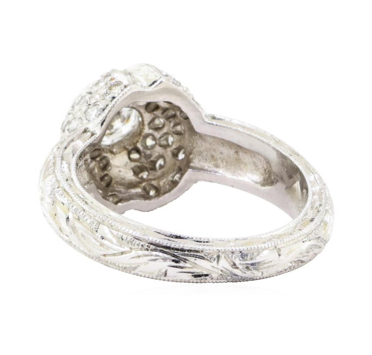 One electronically tested platinum lady's cast wedding ring with a domed shank with a bright polish with milgrain detailing finish. The featured lady's ring has hand engraved details and a shank measuring 3.45 millimeters wide. Identified with markings of