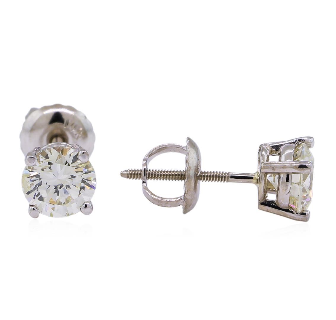 One pair electronically tested 14KT white gold lady's combination cast & assembled 4-prong stud earrings with threaded posts and screw-on/screw-off backs with a bright polish finish. Identified with markings of "14K". Condition is new, good workmanship. Containing: Two prong set round brilliant cut diamonds, measuring 5.14 - 5.10 x 3.15mm (depth est.) approximate total weight of 2 Stones = 1.00ct. Graded in the setting. Clarity: SI-1 to SI-2. Color: G - I. Cut Very Good. Total Weight of Diamonds 1.00ct. Total Weight of Earrings 1.00gm. GAS Appraised at $6,790.00.