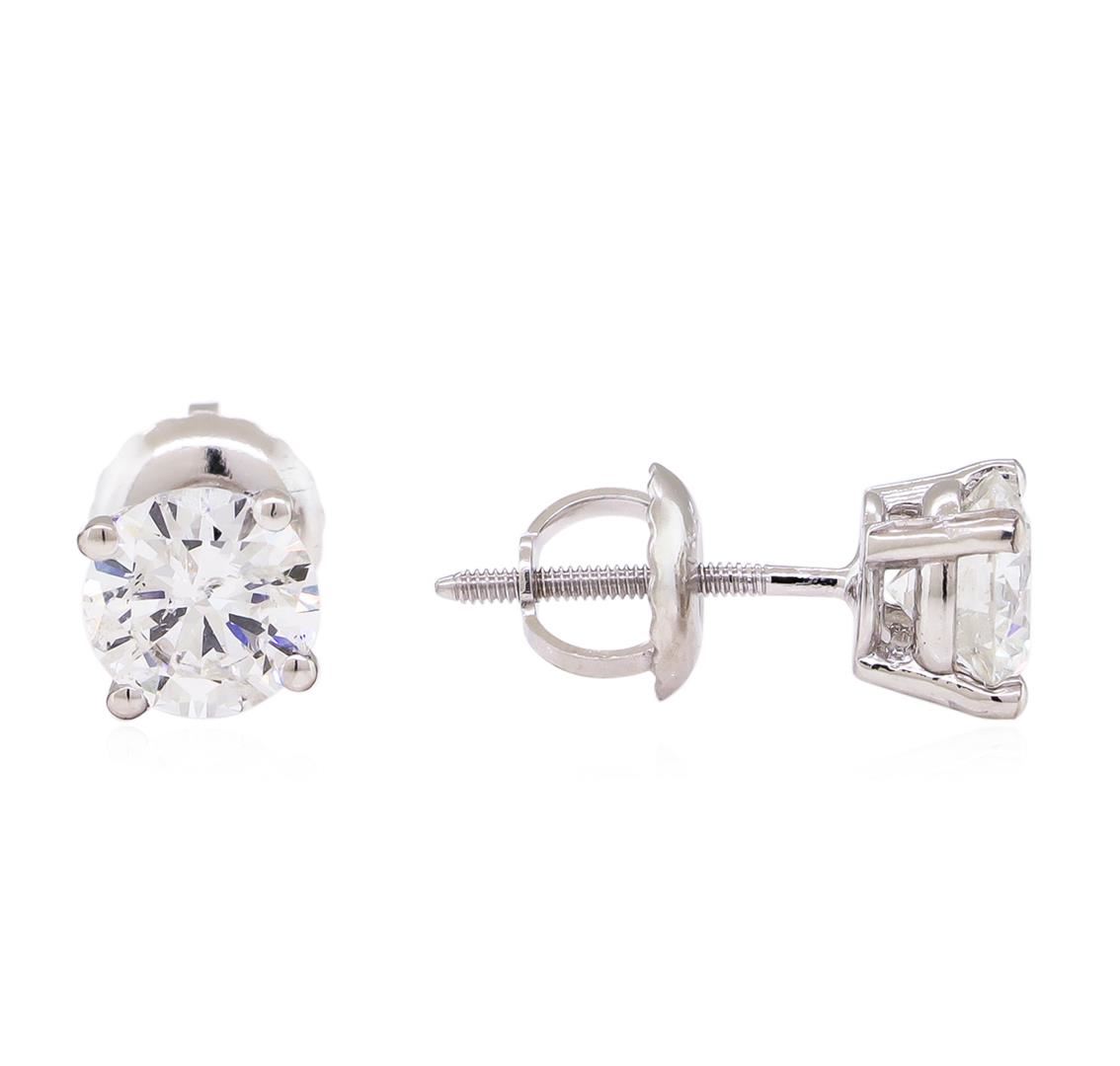 One pair electronically tested 14KT white gold lady's combination cast & assembled 4-prong stud earrings with threaded posts and screw-on/screw-off backs with a bright polish finish. Identified with markings of "14K". Condition is new, good workmanship. Containing: Two prong set round brilliant cut diamonds, measuring 5.00 - 4.88 x 3.16mm (depth est.) approximate total weight of 2 Stones = 1.00ct. Graded in the setting. Clarity: SI-1 to SI-2. Color: G - Very Good. Total Weight of Diamonds 1.00ct. Total Weight of Earrings 1.00gm. GAS Appraised at $7,390.00.