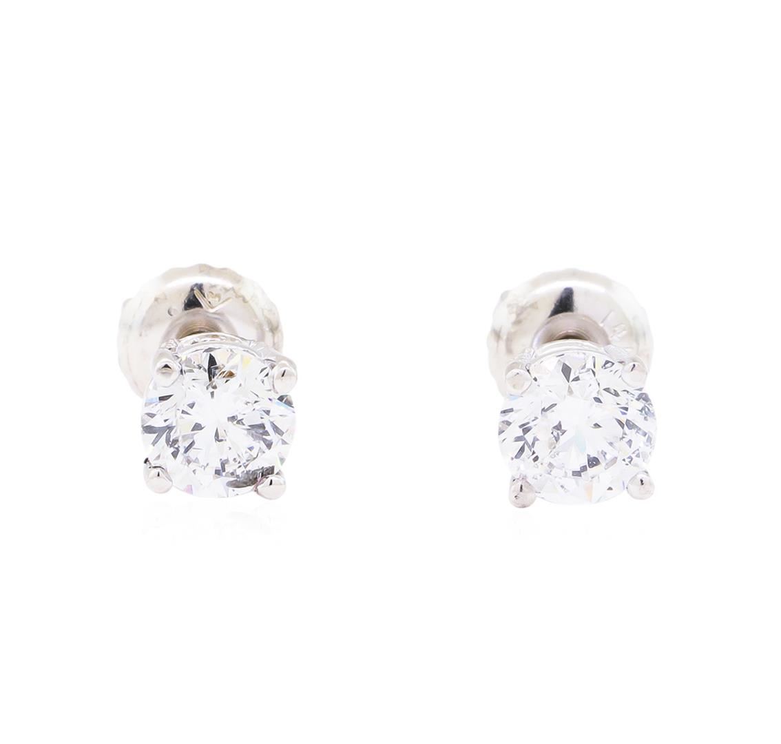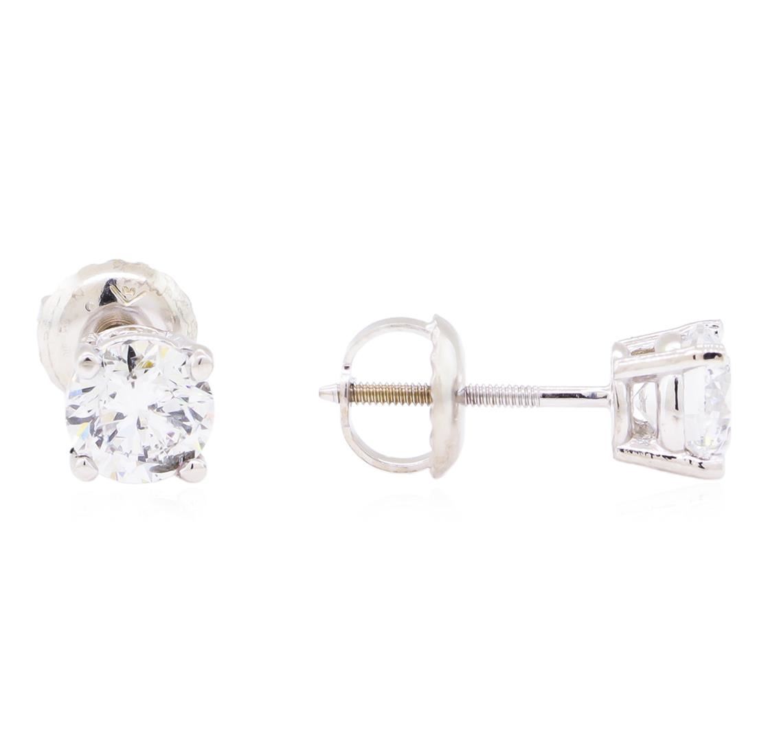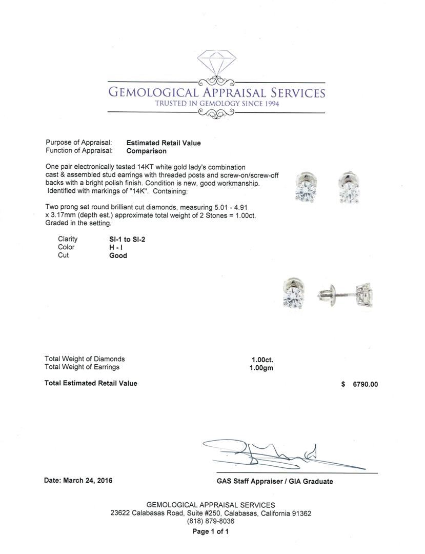 One pair electronically tested 14KT white gold lady's combination cast & assembled stud earrings with threaded posts and screw-on/screw-off backs with a bright polish finish. Identified with markings of "14K". Condition is new, good workmanship. Containing: Two prong set round brilliant cut diamonds, measuring 5.01 - 4.91 x 3.17mm (depth est.) approximate total weight of 2 Stones = 1.00ct. Graded in the setting. Clarity: SI-1 to SI-2. Color: H - I. Cut Good. Total Weight of Diamonds 1.00ct. Total Weight of Earrings 1.00gm. GAS Appraised at $6,790.00.