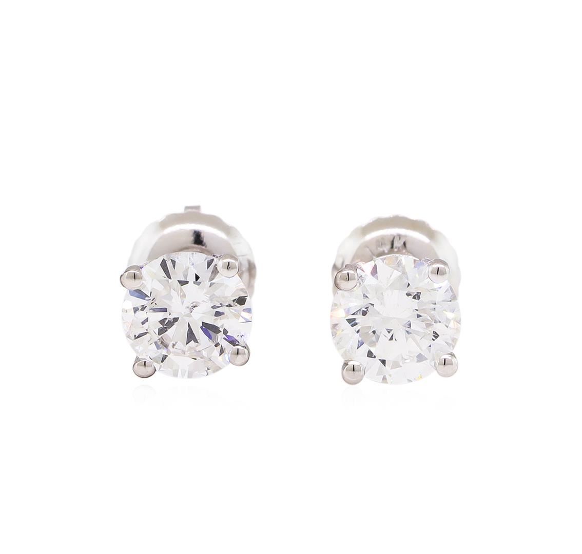One pair electronically tested 14KT white gold lady's combination cast & assembled 4-prong stud earrings with threaded posts and screw-on/screw-off backs with a bright polish finish. Identified with markings of "14K". Condition is new, good workmanship. Containing: Two prong set round brilliant cut diamonds, measuring 5.00 - 4.88 x 3.16mm (depth est.) approximate total weight of 2 Stones = 1.00ct. Graded in the setting. Clarity: SI-1 to SI-2. Color: G - Very Good. Total Weight of Diamonds 1.00ct. Total Weight of Earrings 1.00gm. GAS Appraised at $7,390.00.