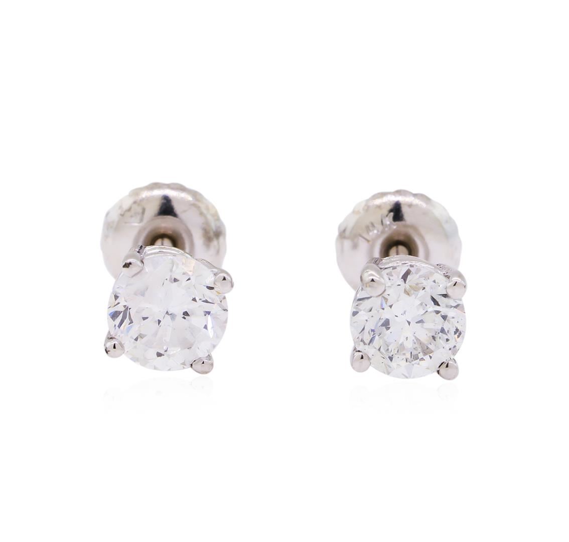 One pair electronically tested 14KT white gold lady's combination cast & assembled stud earrings with threaded posts and screw-on/screw-off backs with a bright polish finish. Identified with markings of "14K". Condition is new, good workmanship. Containing: Two prong set round brilliant cut diamonds, measuring 5.15 - 5.11 x 3.29mm (depth est.) approximate total weight of 2 Stones = 1.00ct. Graded in the setting. Clarity: SI-1 to SI-2. Color: G - H. Cut Very Good. Total Weight of Diamonds 1.00ct. Total Weight of Earrings 1.00gm. GAS Appraised at $7,090.00.