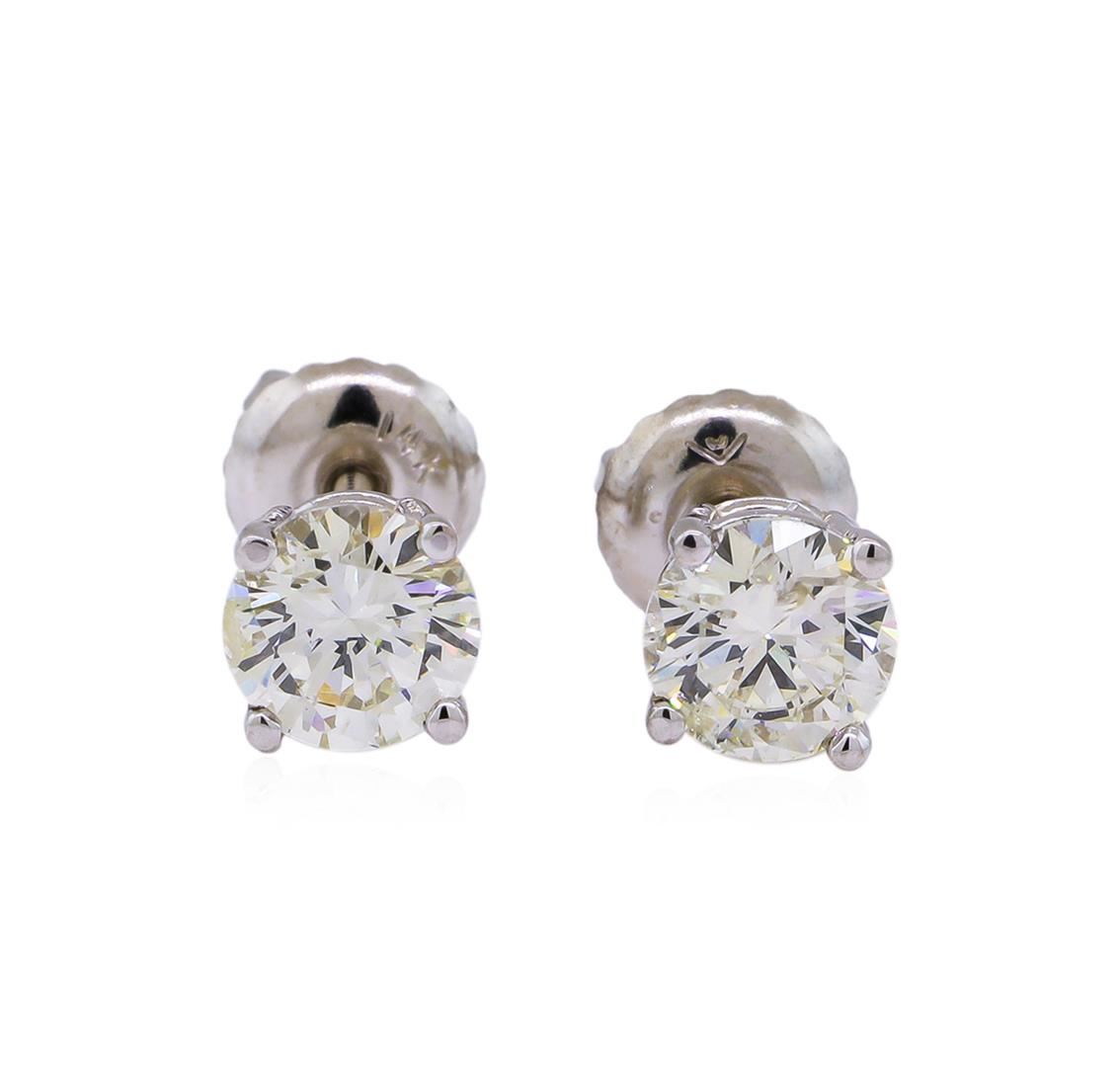 One pair electronically tested 14KT white gold lady's combination cast & assembled 4-prong stud earrings with threaded posts and screw-on/screw-off backs with a bright polish finish. Identified with markings of "14K". Condition is new, good workmanship. Containing: Two prong set round brilliant cut diamonds, measuring 5.14 - 5.10 x 3.15mm (depth est.) approximate total weight of 2 Stones = 1.00ct. Graded in the setting. Clarity: SI-1 to SI-2. Color: G - I. Cut Very Good. Total Weight of Diamonds 1.00ct. Total Weight of Earrings 1.00gm. GAS Appraised at $6,790.00.