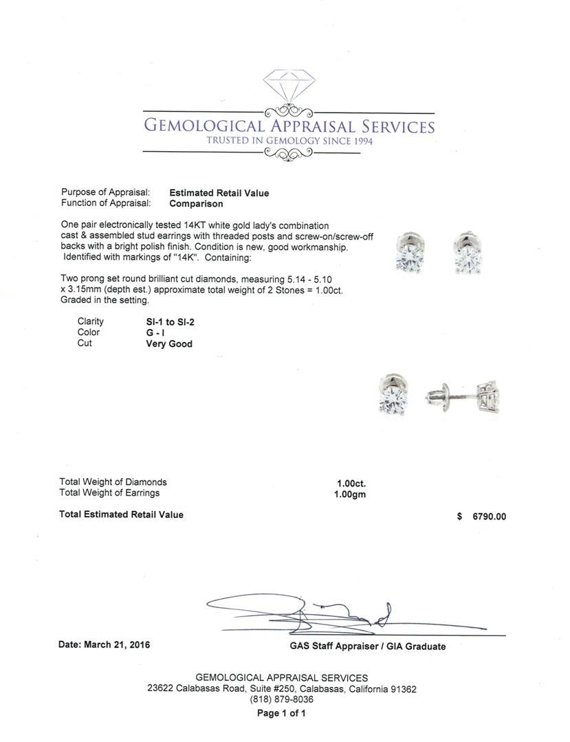 One pair electronically tested 14KT white gold lady's combination cast & assembled 4-prong stud earrings with threaded posts and screw-on/screw-off backs with a bright polish finish. Identified with markings of "14K". Condition is new, good workmanship. Containing: Two prong set round brilliant cut diamonds, measuring 5.14 - 5.10 x 3.15mm (depth est.) approximate total weight of 2 Stones = 1.00ct. Graded in the setting. Clarity: SI-1 to SI-2. Color: G - I. Cut Very Good. Total Weight of Diamonds 1.00ct. Total Weight of Earrings 1.00gm. GAS Appraised at $6,790.00.