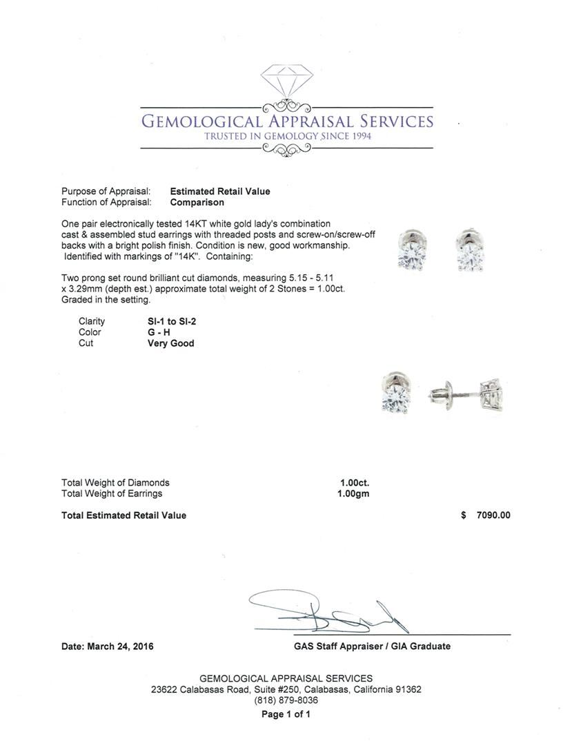 One pair electronically tested 14KT white gold lady's combination cast & assembled stud earrings with threaded posts and screw-on/screw-off backs with a bright polish finish. Identified with markings of "14K". Condition is new, good workmanship. Containing: Two prong set round brilliant cut diamonds, measuring 5.15 - 5.11 x 3.29mm (depth est.) approximate total weight of 2 Stones = 1.00ct. Graded in the setting. Clarity: SI-1 to SI-2. Color: G - H. Cut Very Good. Total Weight of Diamonds 1.00ct. Total Weight of Earrings 1.00gm. GAS Appraised at $7,090.00.