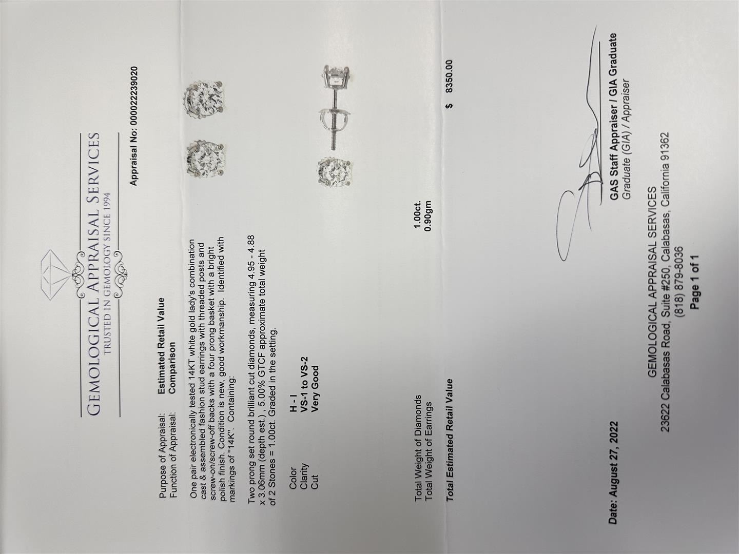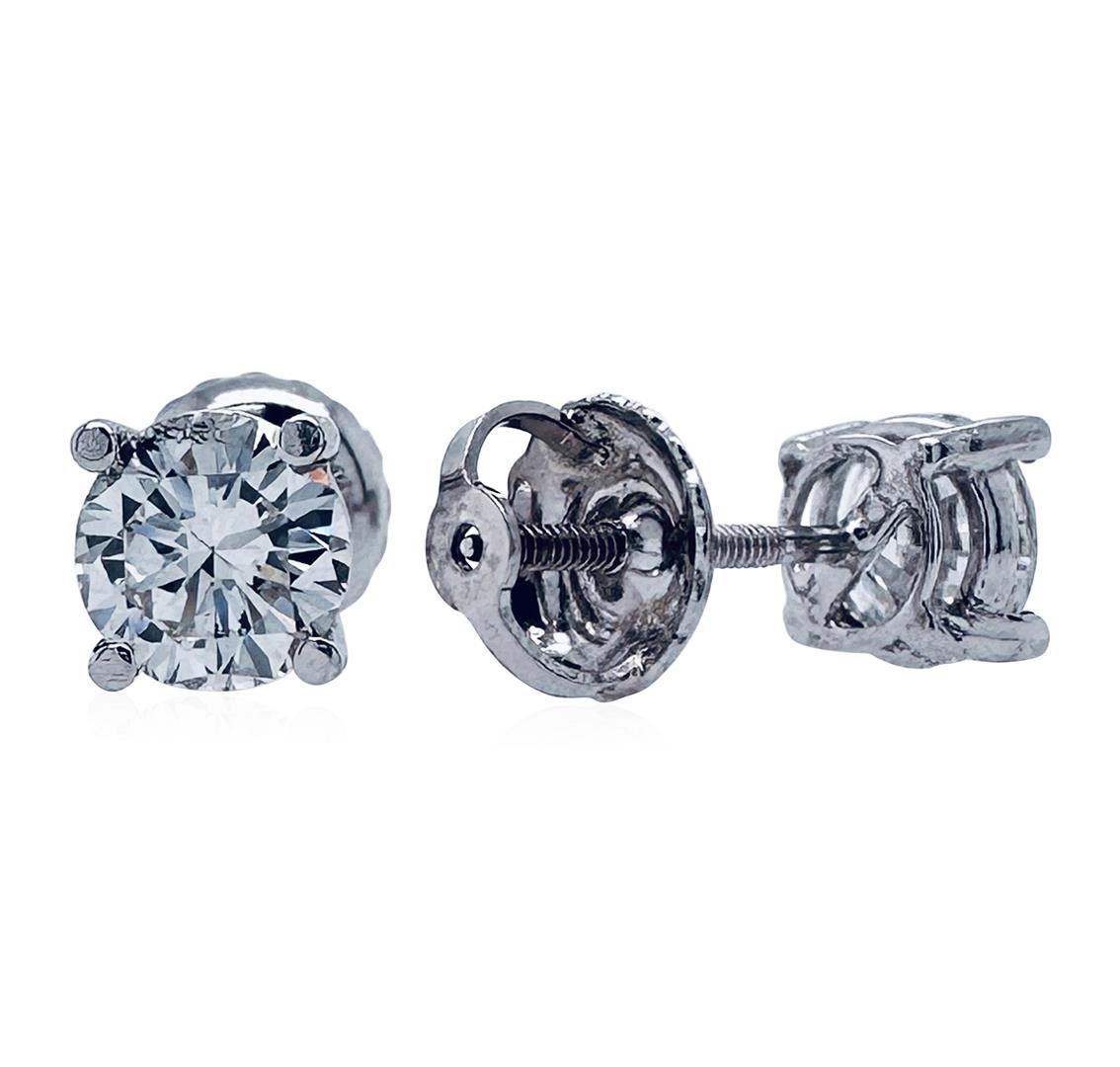 One pair electronically tested 14KT white gold lady's combination cast assembled fashion stud earrings with threaded posts and screw-on/screw-off backs with four prong basket with bright polish finish. Condition is new, good workmanship. Identified with markings of 14K. Containing: 2 prong set round brilliant cut diamonds, approximate total weight of 2 stones = 1.00 ctw. Graded in the setting. Total weight of Diamonds: 1.00 ctw. Total estimated retail value: $8350