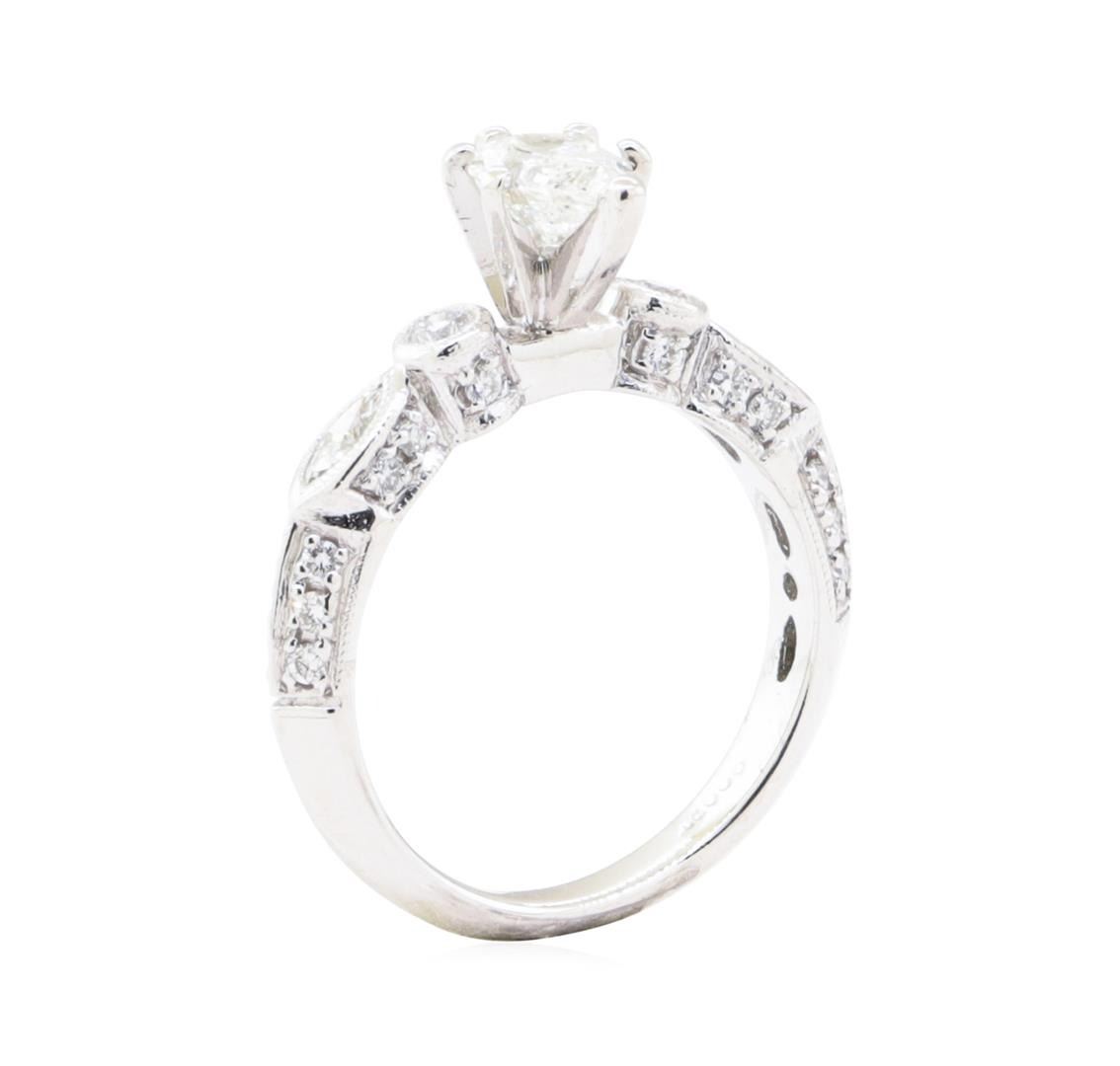 One electronically tested platinum lady's combination cast & assembled designer wedding vintage motif ring with a knife edge shank with a bright polish with milgrain detailing finish. The featured lady's ring has a shank measuring 2.15 millimeters wide. Trademark is Simon G. Identified with markings of '900 PT'. Condition is new, good workmanship. Containing: One prong set pear shaped cut diamond, measuring 6.90 x 4.50 x 3.20mm (depth est.) approximate weight of 0.60ct. Graded in the setting. Color H Clarity VS-2 Cut Very Good Two bezel set marquise shaped cut diamonds, measuring 4.10 x 2.00 x 1.26mm (depth est.) approximate total weight of 2 Stones = 0.14ct. Graded in the setting. Color G - H Clarity VS-2 to SI-1 Cut Very Good Two bezel set round brilliant cut diamonds, measuring 2.00 - 1.95 x 1.23mm (depth est.) approximate total weight of 2 Stones = 0.06ct. Graded in the setting. Color G - H Clarity VS-2 to SI-1 Cut Very Good Twenty-Four prong set round brilliant cut diamonds, measuring 1.30 - 1.25 x 0.79mm (depth est.) approximate total weight of 24 Stones = 0.20ct. Graded in the setting. Color G - H Clarity VS-2 to SI-1 Cut Very Good. Total Weight of Diamonds 1.00ct.. Total Weight of Vintage Motif Ring 5.20gm GAS Appraised at $5420.00. GAS Appraised.