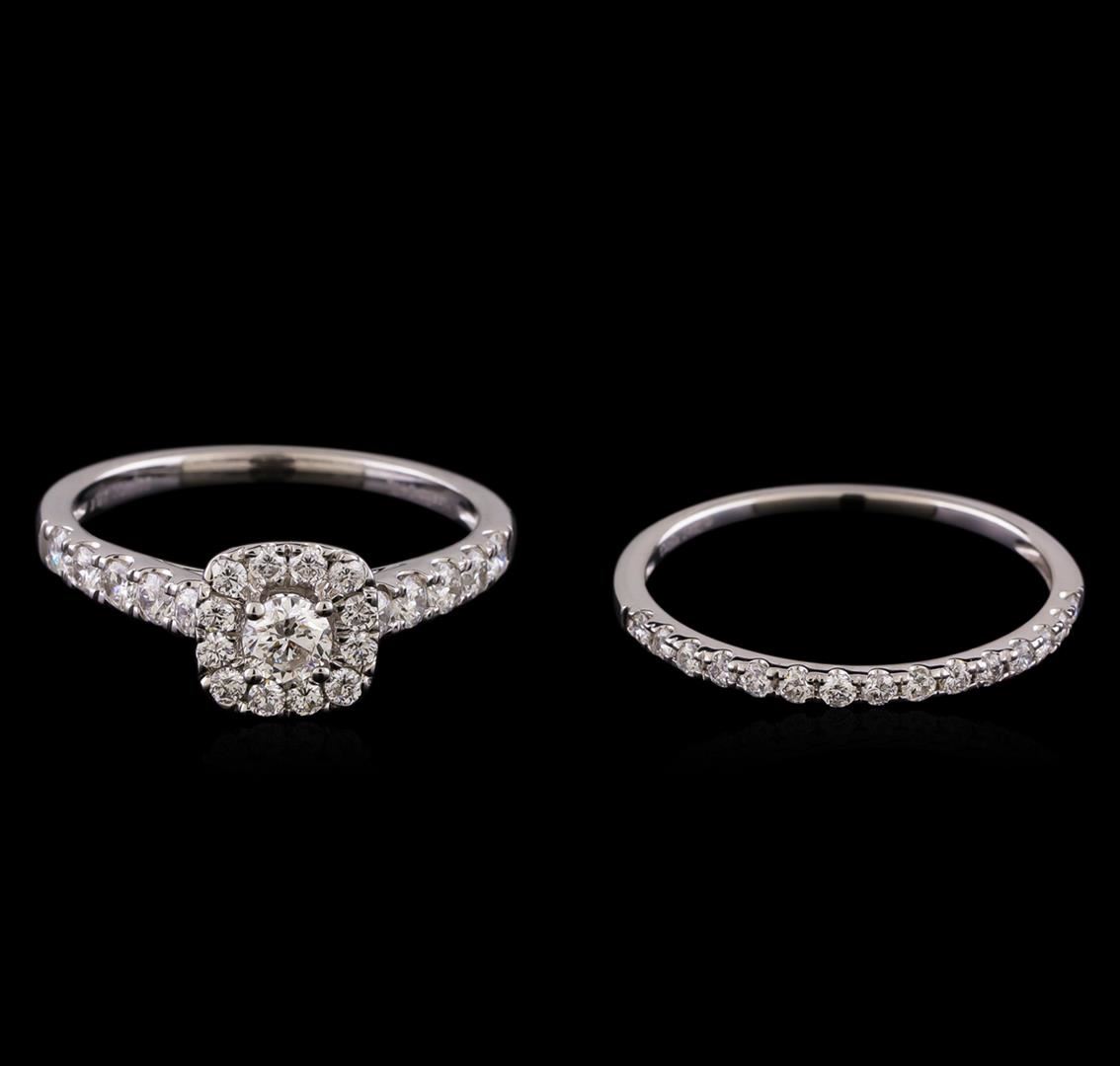 One set electronically tested 14KT white gold lady's cast wedding ring & wedding band with a cathedral halo with a bright polish finish. The featured lady's ring set has a double shank measuring 3.04 millimeters in width. Identified with markings of '14K'. Condition is new, good workmanship. Containing: One prong set round brilliant cut diamond, measuring 3.73 - 3.72 x 2.35mm (depth est.) , 5.00.%. GTCF approximate weight of 0.22ct. Graded in the setting. Clarity SI-2. Color: H - I Cut Good Ten prong set round brilliant cut diamonds, measuring 2.20 - 2.10 x 1.33mm (depth est.) approximate total weight of 10 Stones = 0.38ct. Graded in the setting. Clarity SI-1 to SI-2. Color: H - I Cut Good Twelve prong set round brilliant cut diamonds, measuring 1.70 - 1.65 x 1.04mm (depth est.) approximate total weight of 12 Stones = 0.22ct. Graded in the setting. Clarity SI-1 to SI-2. Color: H - I Cut Good Fifteen prong set round brilliant cut diamonds, measuring 1.50 - 1.45 x 0.92mm (depth est.) approximate total weight of 15 Stones = 0.18ct. Graded in the setting. Clarity SI-1 to SI-2. Color: H - I Cut Good. Total Weight of Diamonds 1.00ct.. Total Weight of Ring & Wedding Band 3.40gm. GAS Appraised at $3,130.00.