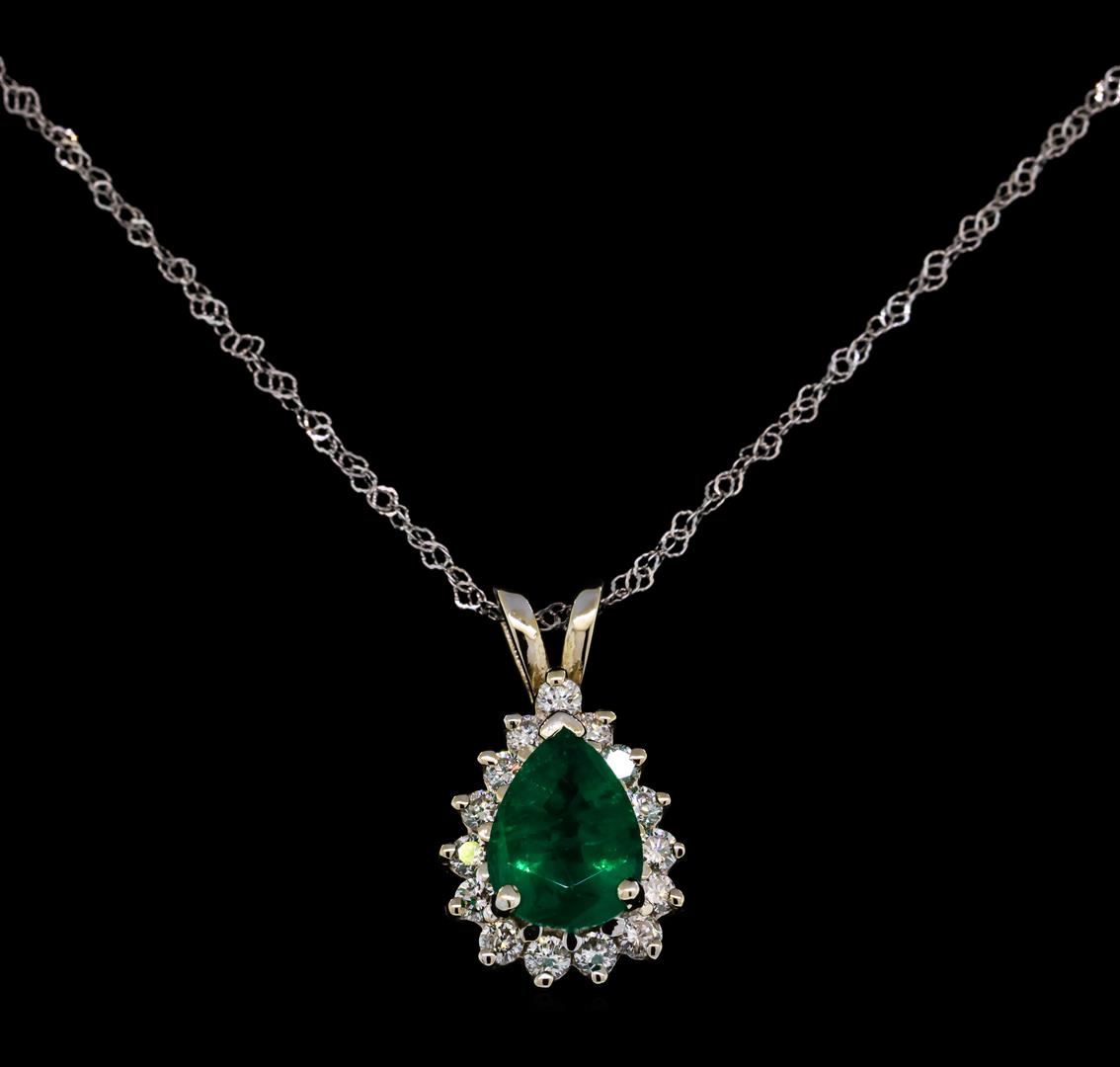 One electronically tested 18KT white gold ladies cast & assembled emerald and diamond pendant with chain. The pendant features an emerald set within a diamond floret completed by a butterfly bail. The pendant is supported by an eighteen inch length 18KT white gold designer style chain, terminating in a spring ring clasp. Bright polish finish. Trademark is GB. Identified with markings of '18K'. Condition is good. Containing: One prong set pear mixed cut natural emerald, measuring 8.00 x 6.10 x 4.00mm, approximate weight of 1.00ct., clarity is moderately included, type III, medium dark, moderately strong, very slightly bluish green color, (GIA vslbG 6/4), cut is good. Transmitting light with a minimum of distortion, transparent. Naturally occurring internal & external characteristics are present. Indications of oil residue. Graded in the setting. Fifteen prong set round brilliant cut diamonds, measuring 1.80 - 1.70 x 1.05mm (depth est.) approximate total weight of 15 Stones = 0.32ct. Graded in the setting. Clarity SI-1 to I-1. Color: E - G. Total Weight of Colored Stones 1.00ct.. Total Weight of Diamonds 0.32ct.. Total Weight of Pendant With Chain 3.42gm. AIG Appraised at $5,360.00.