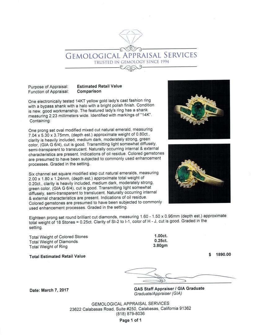 One electronically tested 14KT yellow gold lady's cast fashion ring with a bypass shank with a halo with a bright polish finish. The featured lady's ring has a shank measuring 2.23 millimeters wide. Identified with markings of '14K'. Condition is new, goo GAS Appraised at $1,890.00.