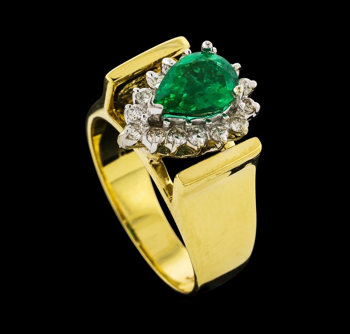 One Emerald and Diamond Ring featuring: 18KT Yellow Gold with a total weight of 6.95 grams, Emerald with a total weight of 1.00ct, and side diamonds with a total weight of 0.25ctw.