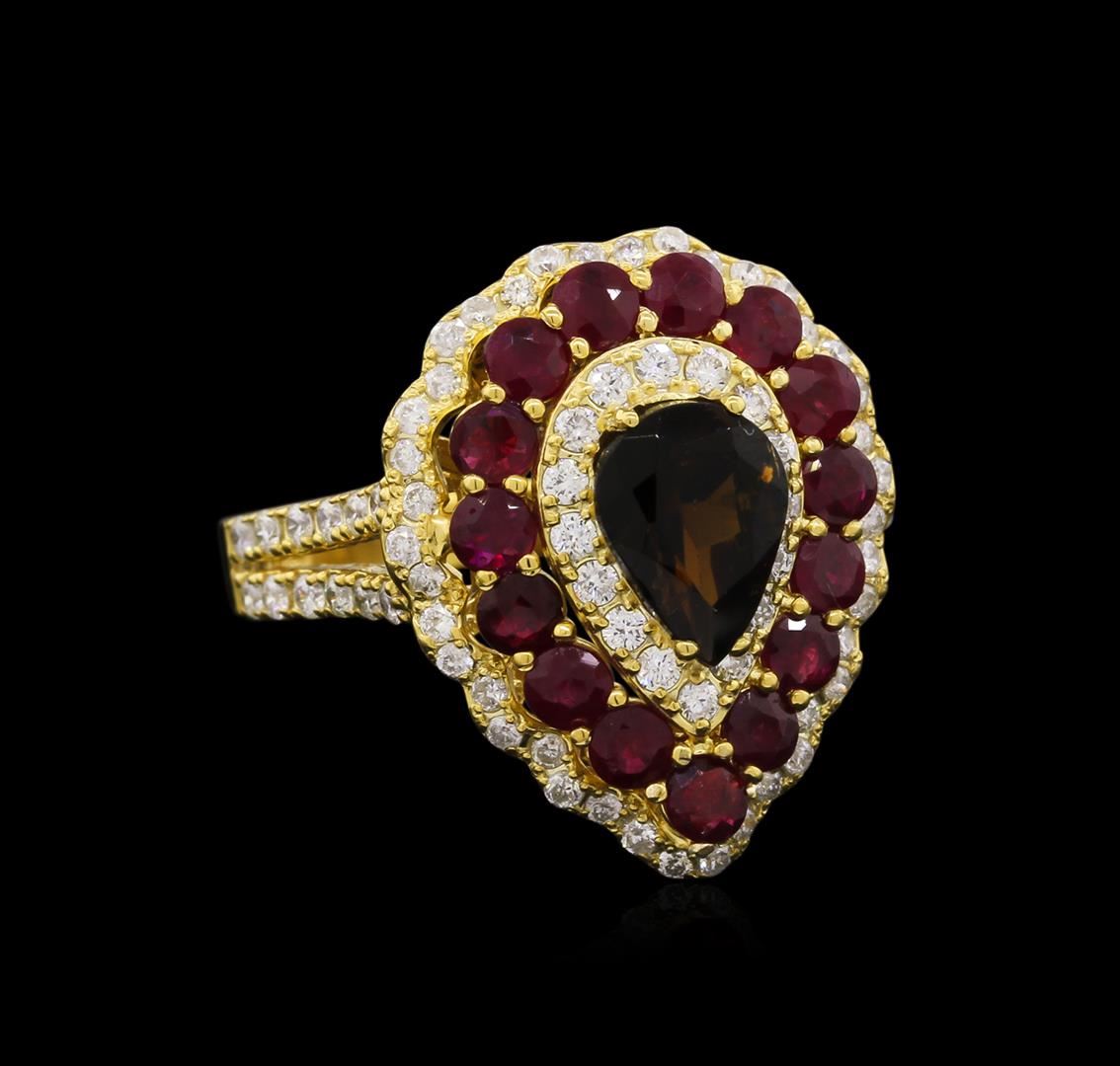 One ring featuring: 14KT yellow gold weighing 5.40 grams containing 15 rubies with a total weight of 1.43ct and one green tourmaline with a total weight of 1.00ct and diamonds with a total weight of 0.64ct.