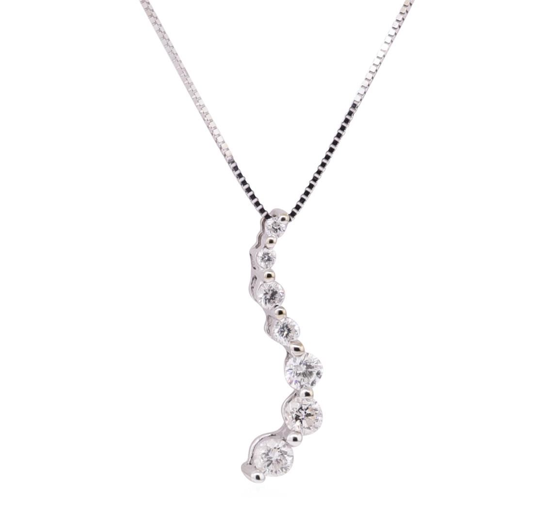 One Journey of Life pendant with chain featuring: 14KT white gold weighing 3.6 grams containing diamonds weighing 1.00ctw. The pendant has an attached twenty-two inch long 0.7mm box chain.