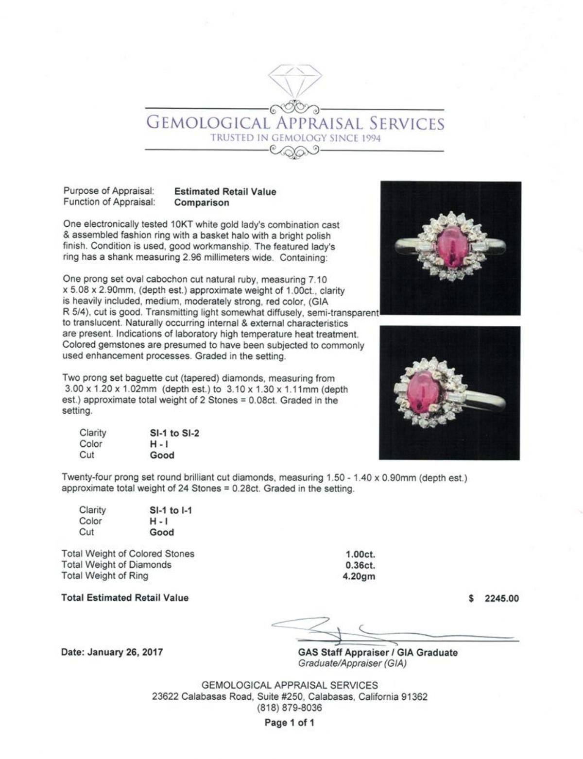 One electronically tested 10KT white gold lady's combination cast & assembled fashion ring with a basket halo with a bright polish finish. The featured lady's ring has a shank measuring 2.96 millimeters wide. Condition is used, good workmanship. Containing: One prong set oval cabochon cut natural ruby, measuring 7.10 x 5.08 x 2.90mm, (depth est.) approximate weight of 1.00 ct., clarity is heavily included, medium, moderately strong, red color, (GIA R 5/4), cut is good. Transmitting light somewhat diffusely, semi-transparent to translucent. Naturally occurring internal & external characteristics are present. Indications of laboratory high temperature heat treatment. Colored gemstones are presumed to have been subjected to commonly used enhancement processes. Graded in the setting. Two prong set baguette cut (tapered) diamonds, measuring from 3.00 x 1.20 x 1.02mm (depth est.) to 3.10 x 1.30 x 1.11mm (depth est.) approximate total weight of 2 Stones = 0.08ct. Graded in the setting. Color H - I Clarity SI-1 to SI-2 Cut Good Twenty-Four prong set round brilliant cut diamonds, measuring 1.50 - 1.40 x 0.90mm (depth est.) approximate total weight of 24 Stones = 0.28ct. Graded in the setting. Color H - I Clarity SI-1 to I-1 Cut Good. Total Weight of Colored Stones 1.00 ct.. Total Weight of Diamonds 0.36ct.. Total Weight of Ring 4.20gm. GAS Appraised.