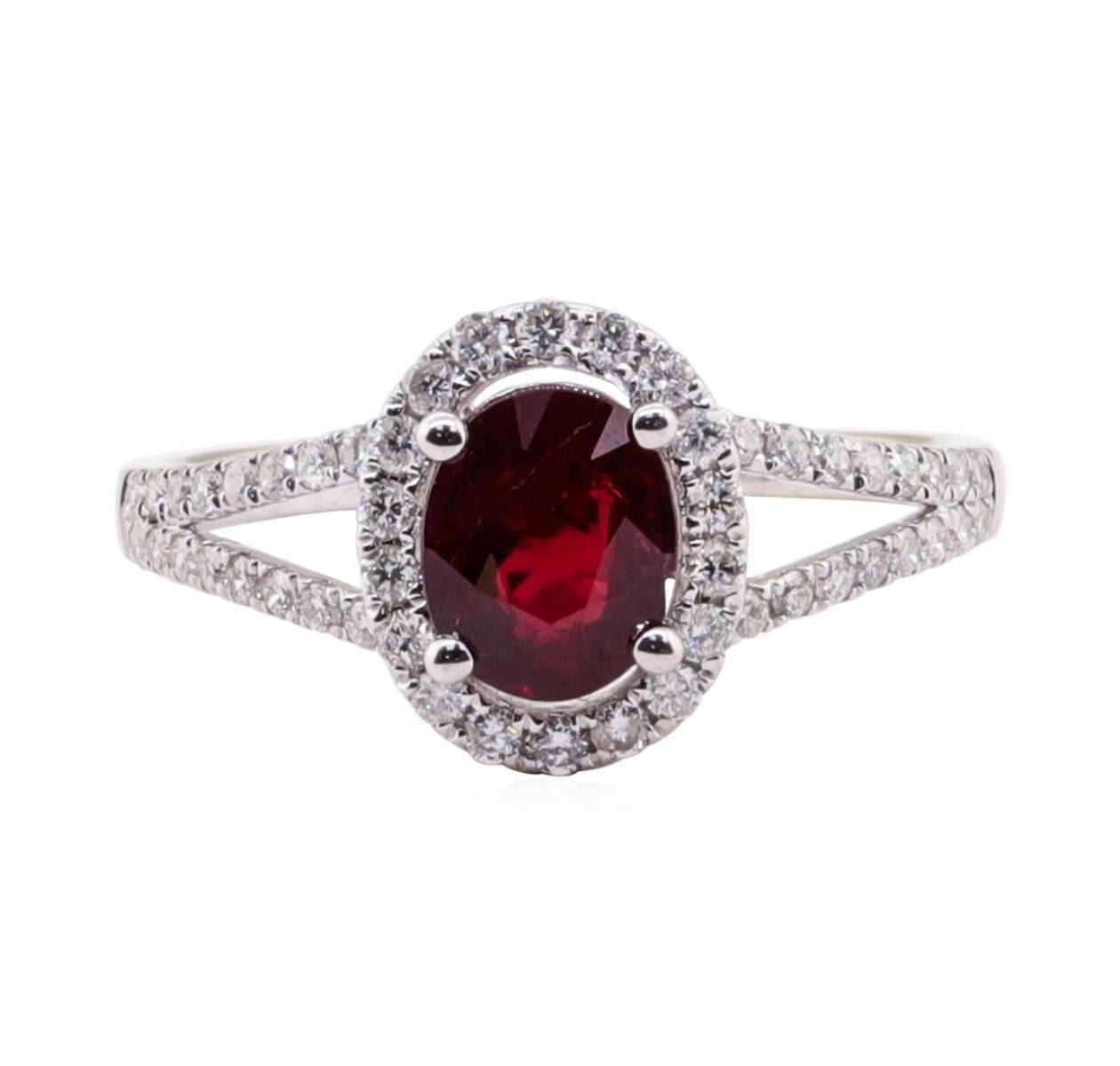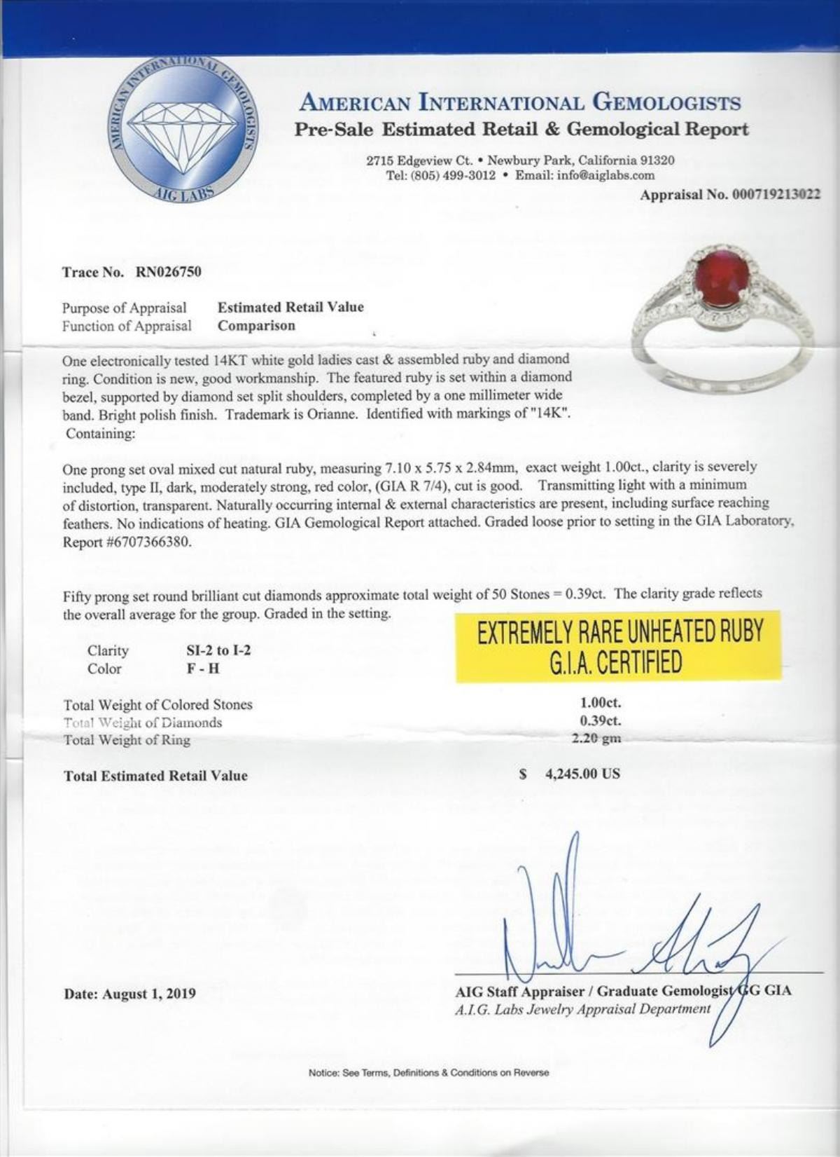 One 1.00 ct Ruby and Diamond Ring - 14KT White Gold. AIG certified. See Appraisal for more details. AIG Appraised.