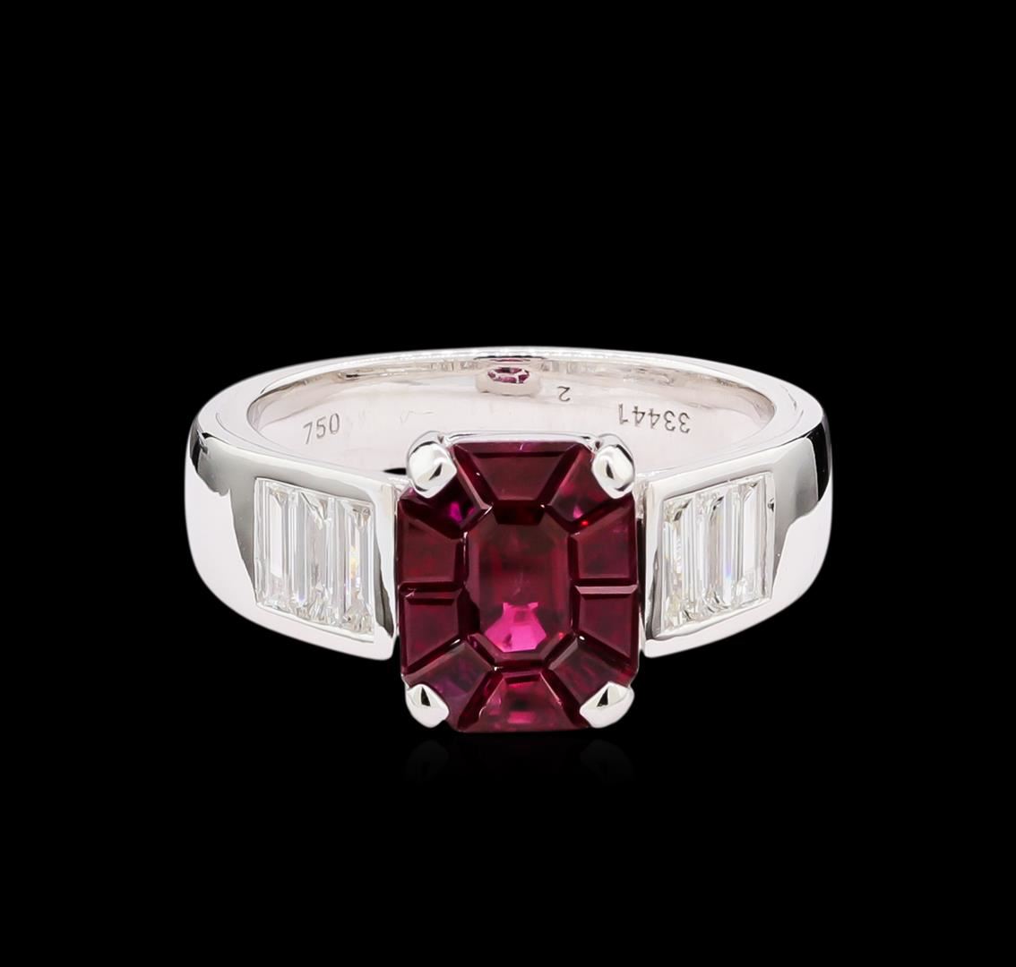 One electronically tested 18KT white gold lady's cast fashion ring with a cathedral shank with a bright polish finish. The featured ladies' ring has a shank measuring 3.96 in width. Identified with markings of "750". Condition is new, good workmanship. Containing: Eleven invisible set mosaic step cut natural rubies, measuring 9.90 x 7.95 x 2.20mm, approximate total weight of 1.00ct., clarity is eye clean, type II, medium dark, moderately strong, red color, (GIA R 6/4), cut is very good. Transmitting light with a minimum of distortion, transparent. Colored gemstones are presumed to have been subjected to commonly used enhancement processes. Graded in the setting. Six channel set baguette cut diamonds, measuring from 4.95 x 2.00 x 1.00mm (depth est.) to 5.00 x 2.20 x 1.00mm (depth est.) approximate total weight of 6 Stones = 0.60ct. Graded in the setting. Clarity: VS-1 to VS-2. Color: F - Very Good. Total Weight of Colored Stones 1.00ct. Total Weight of Diamonds 0.60ct. Total Weight of Ring 7.40gm. GAS Appraised at $6,275.00.