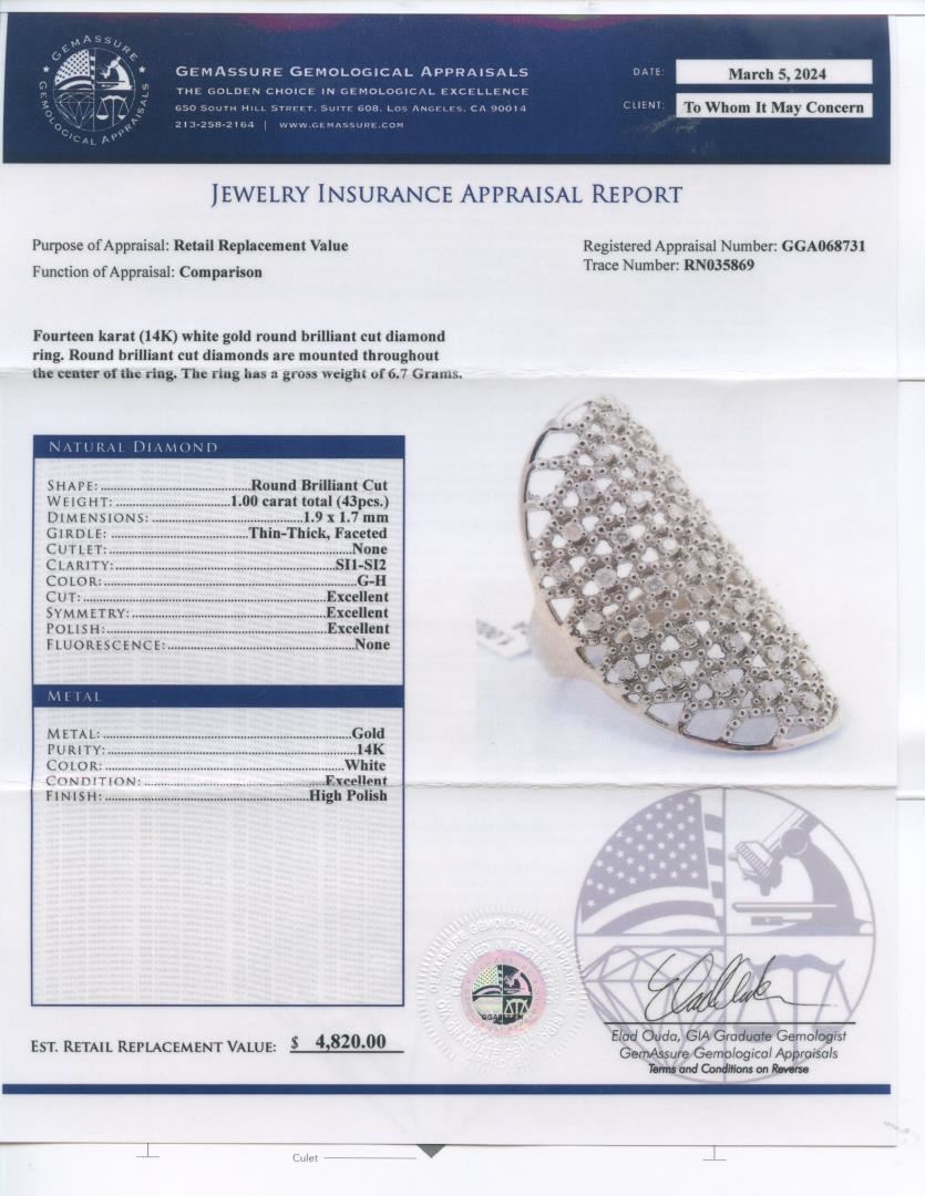 Fourteen karat (14K) white gold round brilliant cut diamond ring. Round brilliant cut diamonds are mounted throughout the center of the ring. The ring has 3 gross weight of 6.7 Grams. #NATURAL DIAMOND# SHAPE: Round Brilliant Cut; WEIGHT: 1.00 carat total (43pcs.); DIMENSIONS: 1.9 x 1.7mm; GIRDLE: Thin Thick, Faceted; CUTLET: None; CLARITY: SI1-SI2; COLOR: G-H; CUT: Excellent; SYMMETRY: Excellent; POLISH: Excellent; FLUORESCENCE: None #METAL# METAL: Gold; PURITY: 14K; COLOR: White; CONDITION: Excellent; FINISH: High Polish #Size: 6 1/4