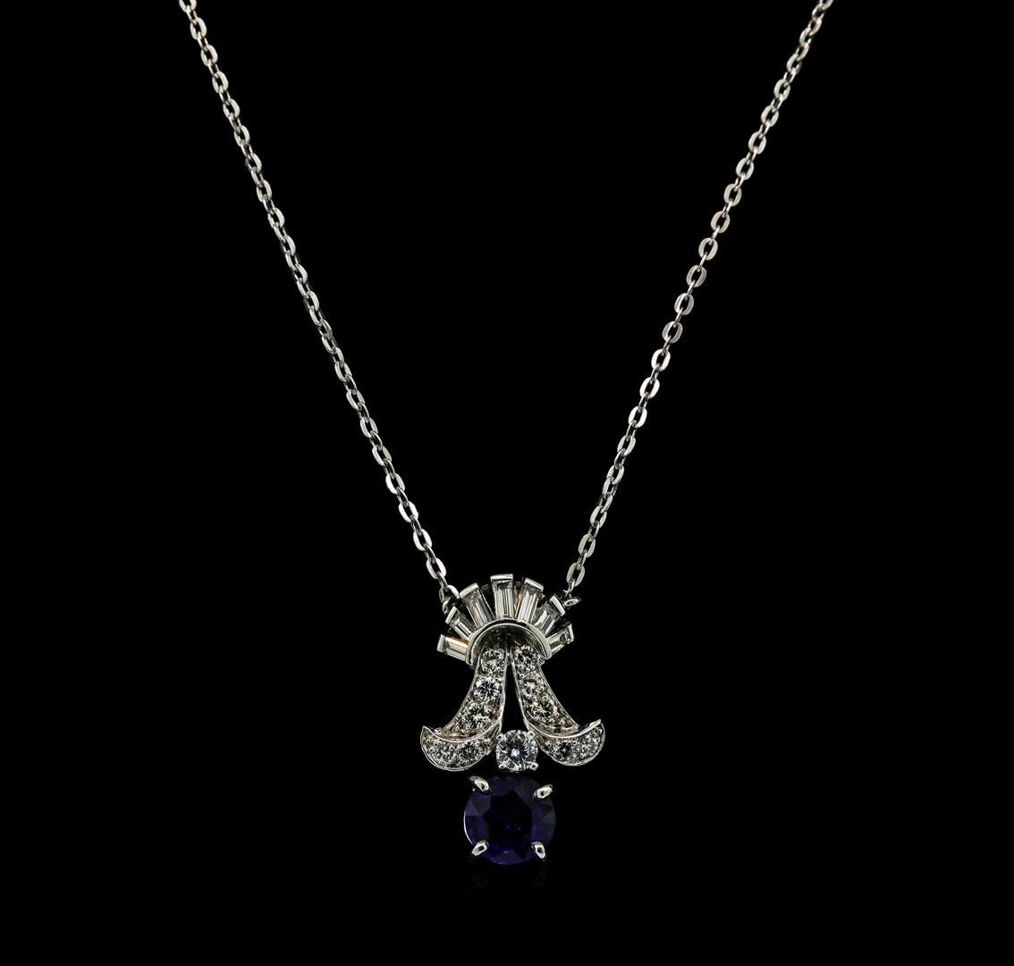 One electronically tested platinum & 14KT white gold ladies cast & assembled sapphire and diamond pendant with chain. The platinum pendant features a free hanging sapphire under a diamond set stylized umbrella, completed by a hidden bail. The pendant is supported by a 14KT white gold chain, terminating in a platinum spring ring clasp. Bright polish finish. Condition is good. Containing: One prong set round mixed cut natural blue sapphire, measuring 6.20 - 6.20 x 3.20 mm, approximate weight of 1.00ct., clarity is slightly included, type II, medium dark, very slightly grayish, blue color, (GIA B 6/3), cut is good. Transmitting light with a minimum of distortion, transparent. Naturally occurring internal & external characteristics are present. Graded in the setting. One prong set round brilliant cut diamond, measuring 2.90 - 2.90 x 1.74mm (depth est.) approximate weight of 0.09ct. Graded in the setting. Clarity I-1. Color: G Ten prong set round brilliant cut diamonds, measuring 1.90 - 1.60 x 1.05mm (depth est.) approximate total weight of 10 Stones = 0.20ct. Graded in the setting. Clarity VS-1 to SI-1. Color: G - H Seven prong set baguette cut (tapered) diamonds, measuring from 2.00 x 1.20 x 0.84mm (depth est.) to 3.00 x 1.30 x 0.91mm (depth est.) approximate total weight of 7 Stones = 0.18ct. Graded in the setting. Clarity VS-1 to SI-1. Color: G - H. Total Weight of Colored Stones 1.00ct.. Total Weight of Diamonds 0.47ct.. Total Weight of Pendant With Chain 5.47gm. AIG Appraised at $3,860.00.