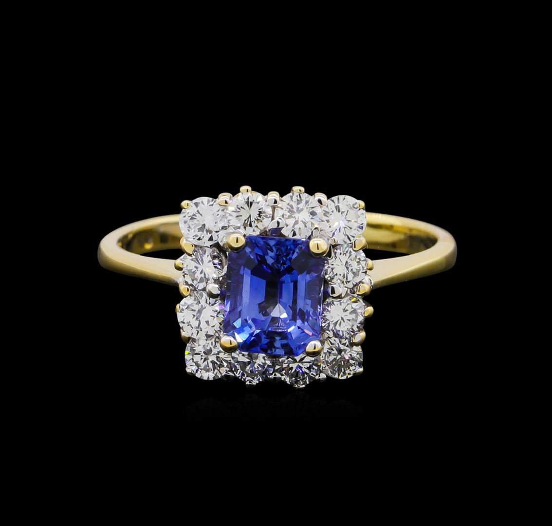 One electronically tested 14KT white gold ladies cast sapphire and diamond ring. The featured sapphire is set within a diamond bezel supported by a ribbed under gallery, completed by a one and one-half millimeter wide band. Bright polish finish with yellow gold overlay. Identified with markings of "14K". Condition is good. Containing: One prong set emerald step cut natural blue sapphire, measuring 6.00 x 4.90 x 3.60mm, approximate weight of 1.00ct., clarity is slightly included, type II, medium, very slightly grayish, violetish blue color, (GIA vB 5/3), cut is good. Transmitting light with a minimum of distortion, transparent. Naturally occurring internal & external characteristics are present. Graded in the setting. Twelve prong set round brilliant cut diamonds, measuring 2.50 - 2.20 x 1.41mm (depth est.) approximate total weight of 12 Stones = 0.60ct. The clarity grade reflects the average range of clarity for this group. Graded in the setting. Clarity: VS-1 to SI-2. Color: F - H. Total Weight of Colored Stones 1.00ct. Total Weight of Diamonds 0.60ct. Total Weight of Ring 3.33gm. AIG Appraised at $4,025.00.